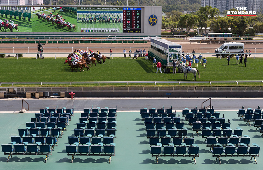 ภาพที่นั่งอันว่างเปล่าระหว่างที่ม้าอออกตัววิ่งที่สนาม Sha Tin Racecourse ในฮ่องกง เมื่อวันที่ 23 กุมภาพันธ์ 2020 โดยสถานที่สาธารณะรอบ Sha Tin Racecourse ถูกปิดเนื่องจากสถานการณ์การแพร่ระบาดของโควิด-19