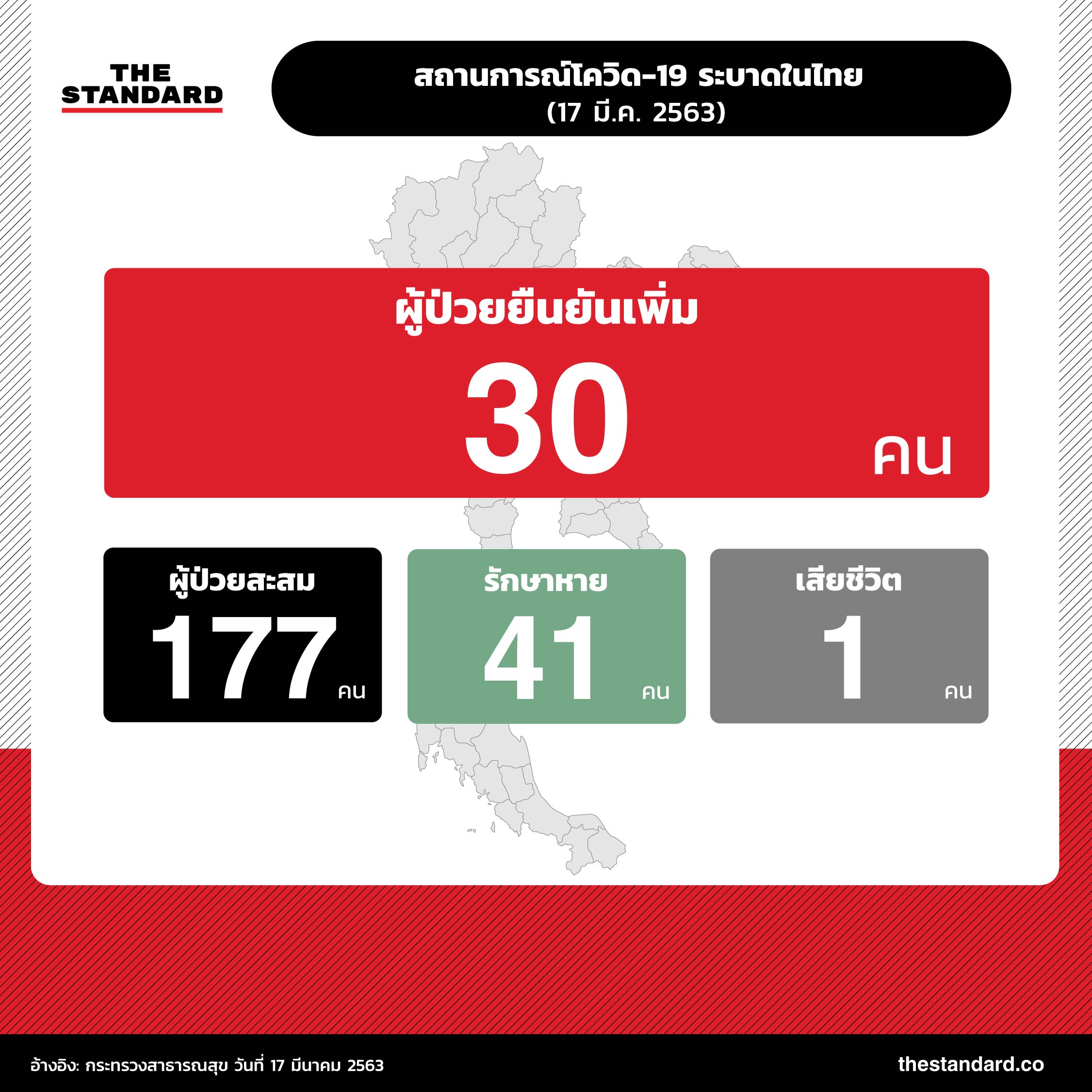 วันนี้ (17 มีนาคม) นายแพทย์สุขุม กาญจนพิมาย ปลัดกระทรวงสาธารณสุข แถลงข่าวสถานการณ์โรคติดเชื้อไวรัสโคโรนา 2019 โดยระบุว่า วันนี้มีผู้ป่วยรักษาหายกลับบ้าน 3 ราย จากสถาบันโรคทรวงอก 1 ราย จากสถาบันบำราศนราดูร 2 ราย ขณะเดียวกันก็พบผู้ป่วยยืนยันเพิ่ม 30 ราย แบ่งเป็น 2 กลุ่มดังนี้