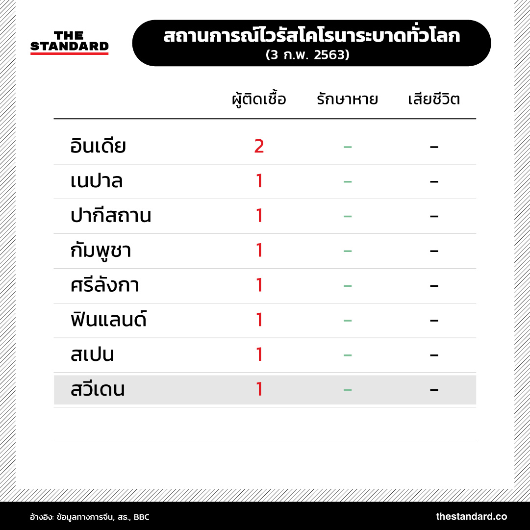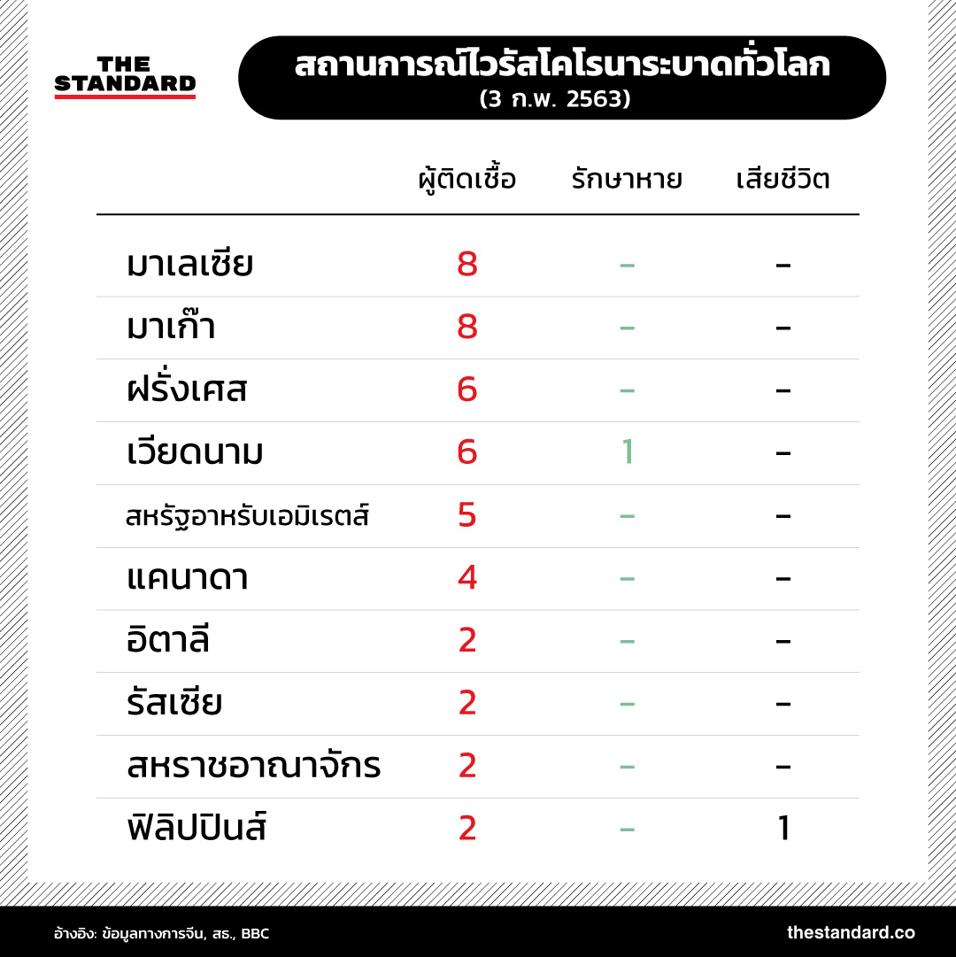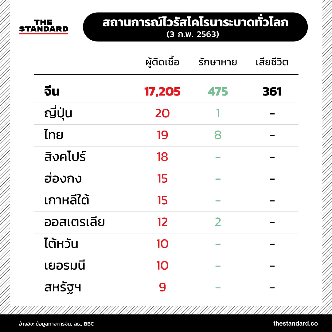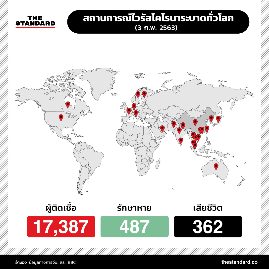 ยอดผู้เสียชีวิตโรคปอดอักเสบจากไวรัสโคโรนาสายพันธุ์ใหม่ 2019-nCoV ในจีนพุ่งสูงขึ้นเป็น 361 รายแล้ว และมีแนวโน้มเพิ่มสูงขึ้นเรื่อยๆ เช่นเดียวกับจำนวนผู้ติดเชื้อทั้งในประเทศจีนและในต่างประเทศที่เพิ่มมากขึ้นอย่างต่อเนื่อง สถานการณ์การระบาดล่าสุดเป็นอย่างไร THE STANDARD ได้รวบรวมข้อมูลตัวเลขมาไว้ที่นี่แล้ว