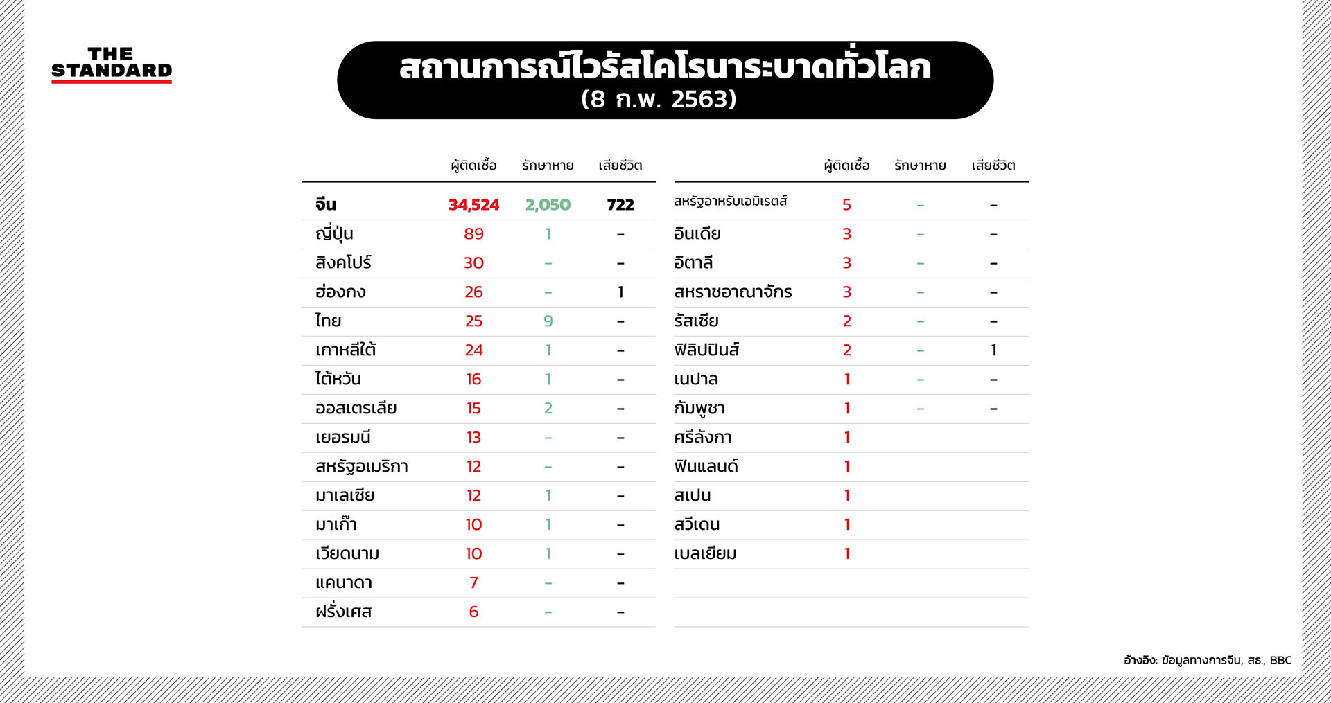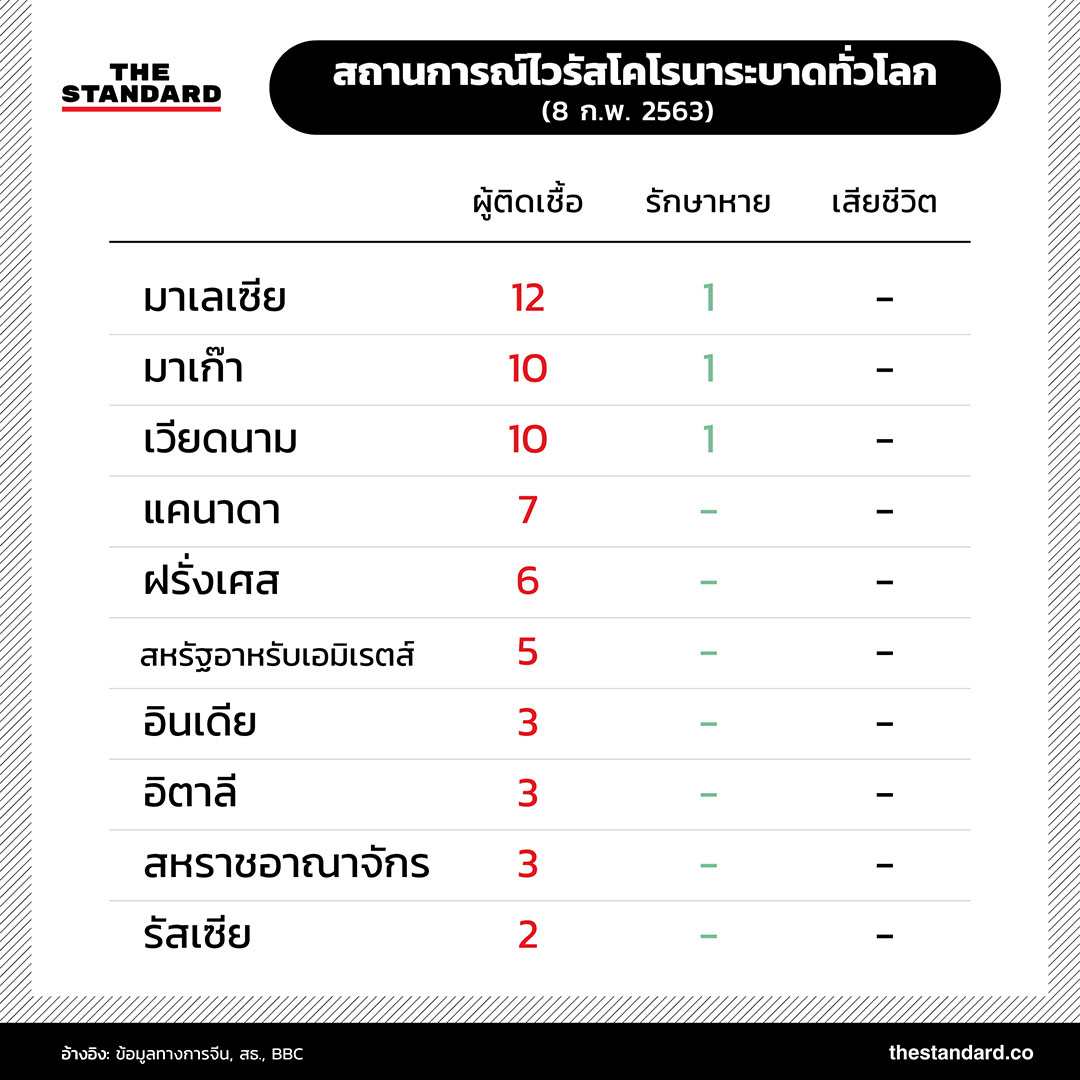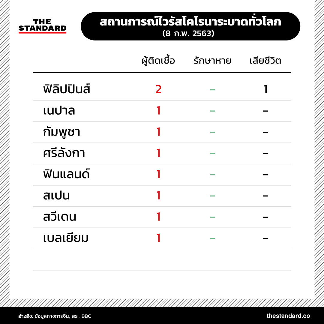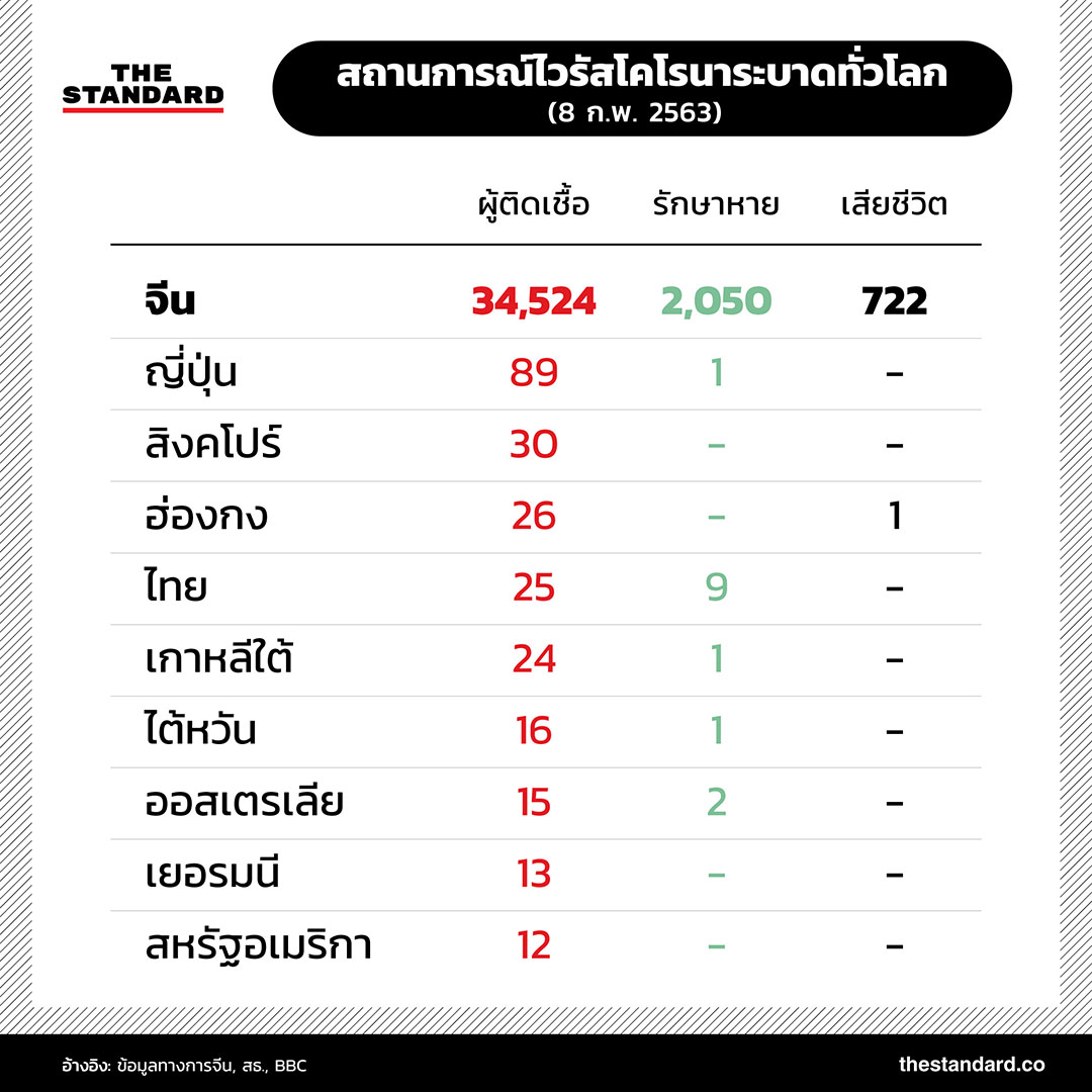 ยอดผู้เสียชีวิตจากไวรัสโคโรนาสายพันธุ์ใหม่ 2019-nCoV ในจีนพุ่งสูงขึ้นเป็น 722 รายแล้ว และมีแนวโน้มเพิ่มสูงขึ้นเรื่อยๆ เช่นเดียวกับจำนวนผู้ติดเชื้อทั้งในประเทศจีนและในต่างประเทศที่เพิ่มมากขึ้นอย่างต่อเนื่อง สถานการณ์การระบาดล่าสุดเป็นอย่างไร THE STANDARD ได้รวบรวมข้อมูลตัวเลขมาไว้ที่นี่แล้ว