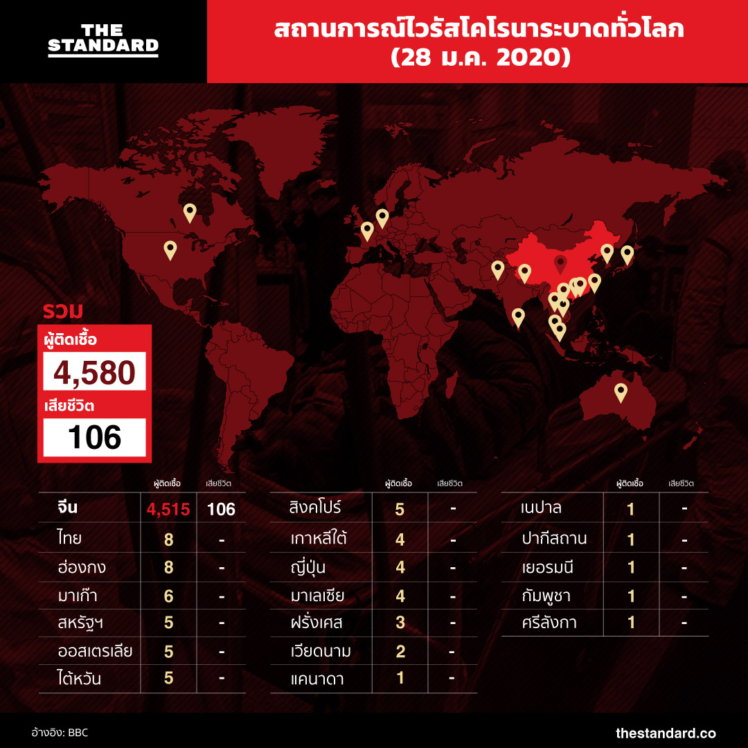 ยอดผู้เสียชีวิตโรคปอดอักเสบจากไวรัสโคโรนาสายพันธุ์ใหม่ 2019-nCoV ในจีนพุ่งสูงขึ้นเป็น 106 รายจาก 80 รายเมื่อวันก่อน และมีแนวโน้มเพิ่มสูงขึ้นเรื่อยๆ เช่นเดียวกับผู้ติดเชื้อทั้งในประเทศจีนและในต่างประเทศที่เพิ่มจำนวนขึ้นอย่างต่อเนื่อง สถานการณ์การระบาดล่าสุดเป็นอย่างไร THE STANDARD ได้รวบรวมข้อมูลตัวเลขมาไว้ที่นี่แล้ว