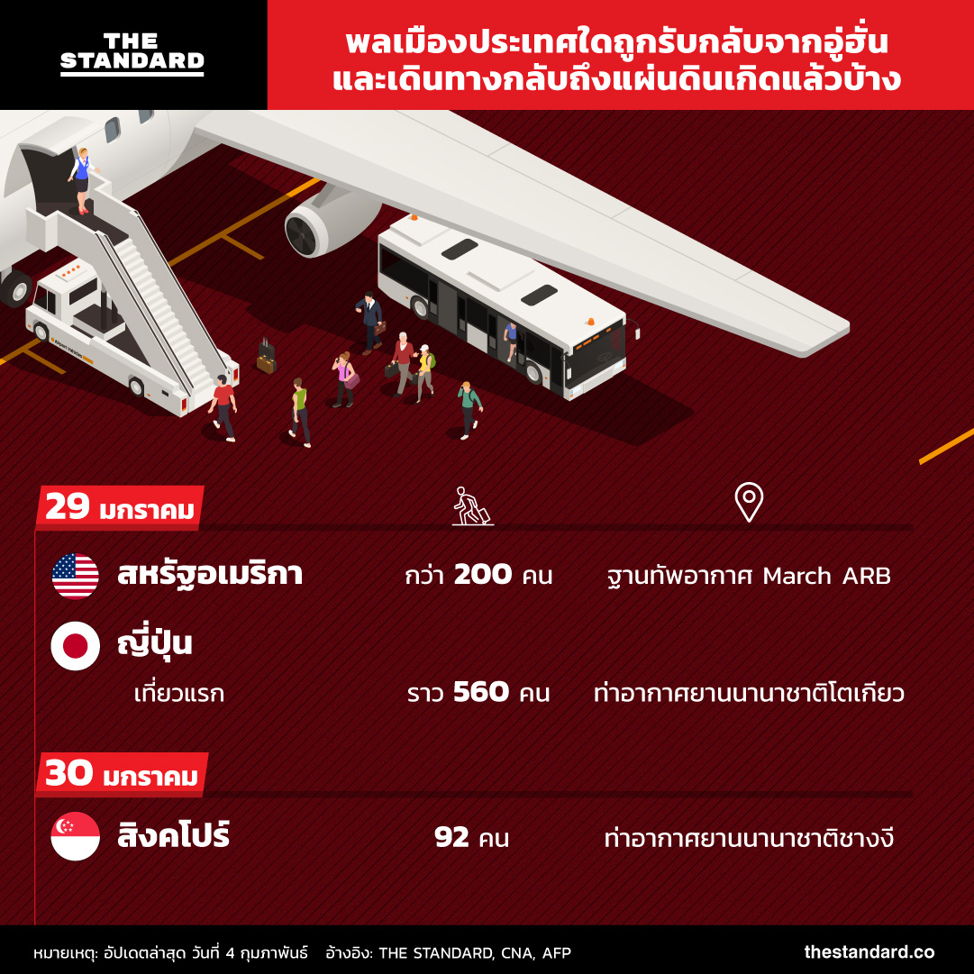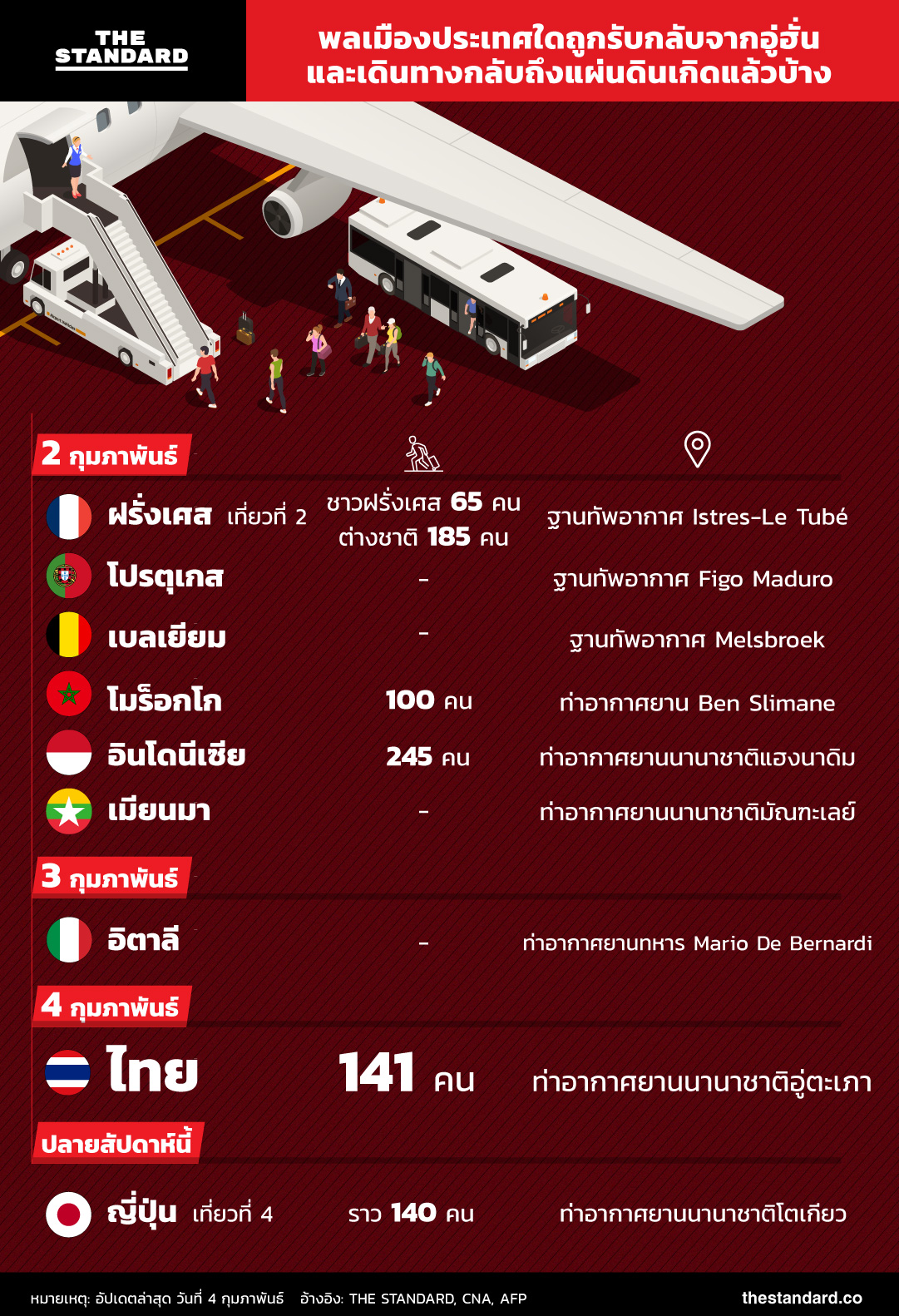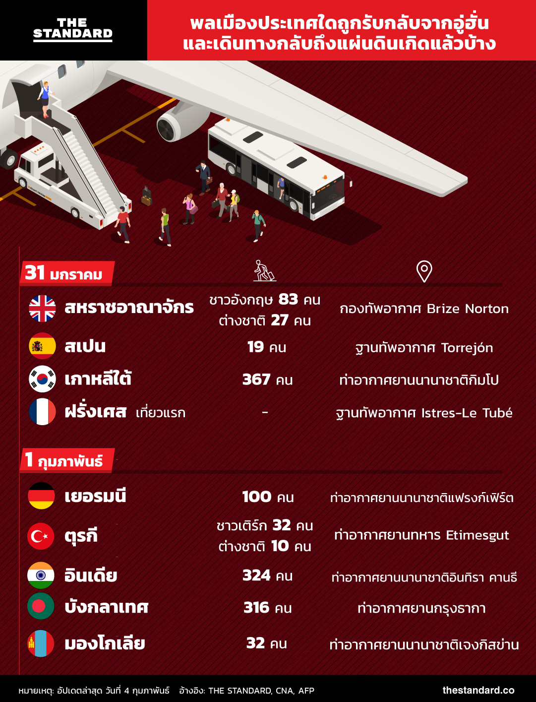 นี่คือภาพรวมภารกิจรับพลเมืองจากอู่ฮั่น มณฑลหูเป่ยของจีน กลับประเทศของรัฐบาลนานาชาติ ท่ามกลางสถานการณ์การแพร่ระบาดของเชื้อไวรัสโคโรนาสายพันธุ์ใหม่ โดยล่าสุดคนไทยที่ไปศึกษาต่อและพำนักอยู่ในเมืองอู่ฮั่นและพื้นที่โดยรอบจะถูกรับตัวกลับถึงท่าอากาศยานนานาชาติอู่ตะเภา จังหวัดระยอง ในวันนี้ (4 กุมภาพันธ์) ก่อนที่จะกักตัวเพื่อเฝ้าดูอาการนาน 14 วันตามระยะฟักตัวของเชื้อไวรัส หากผ่านการติดตามอาการจะสามารถเดินทางกลับบ้านได้ตามปกติ
