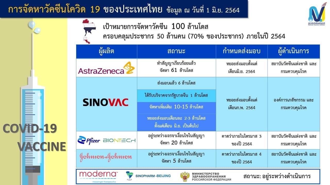 อย่างไรก็ตาม จำนวน 105.5 ล้านโดสนี้เป็นยอดจองวัคซีนที่จะทยอยส่งมอบจนครบภายในปีนี้ ในขณะที่ขณะนี้ไทยได้รับวัคซีนจาก AstraZeneca แล้ว 2.757 ล้านโดส (รวมตั้งแต่ต้นปี) จากแผนเดิมจะต้องได้รับ 6 ล้านโดสภายในเดือนมิถุนายน และจะได้รับเดือนละ 10 ล้านโดสจนถึงเดือนพฤศจิกายน และในเดือนธันวาคมอีก 5 ล้านโดส ส่วนวัคซีน Sinovac ได้รับรวม 7 ล้านโดส จากแผนเดิม 2 ล้านโดส และจะทยอยส่งมอบอีกเดือนละ 2-3 โดสตั้งแต่เดือนมิถุนายนเป็นต้นไป