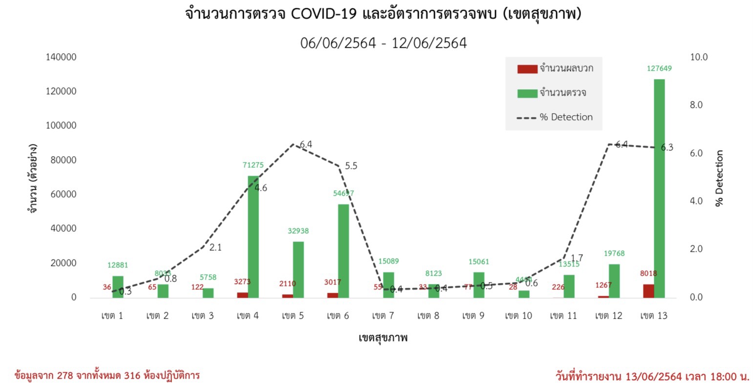 อัตราการตรวจพบคือ ‘จำนวนการตรวจพบเชื้อ’ หารด้วย ‘จำนวนการตรวจทั้งหมด’ เปรียบเทียบได้กับหากมีค่าสูงแสดงว่าตัวตั้งมาก เช่น พบผู้ติดเชื้อใน กทม. มาก หรือตัวหารน้อย เช่น ตรวจหาเชื้อน้อย ซึ่งอาจเป็นการตรวจเชิงรับที่โรงพยาบาล การตรวจเชิงรุกในชุมชน หรือการสุ่มตรวจตามสถานที่เฉพาะ เช่น แคมป์คนงาน โรงงาน ซึ่งจะต้องวิเคราะห์ต่อว่าควรเพิ่มการตรวจหาเชื้อในลักษณะใด เช่น ผู้มีอาการเข้าถึงการตรวจหาเชื้อที่โรงพยาบาลได้หรือไม่