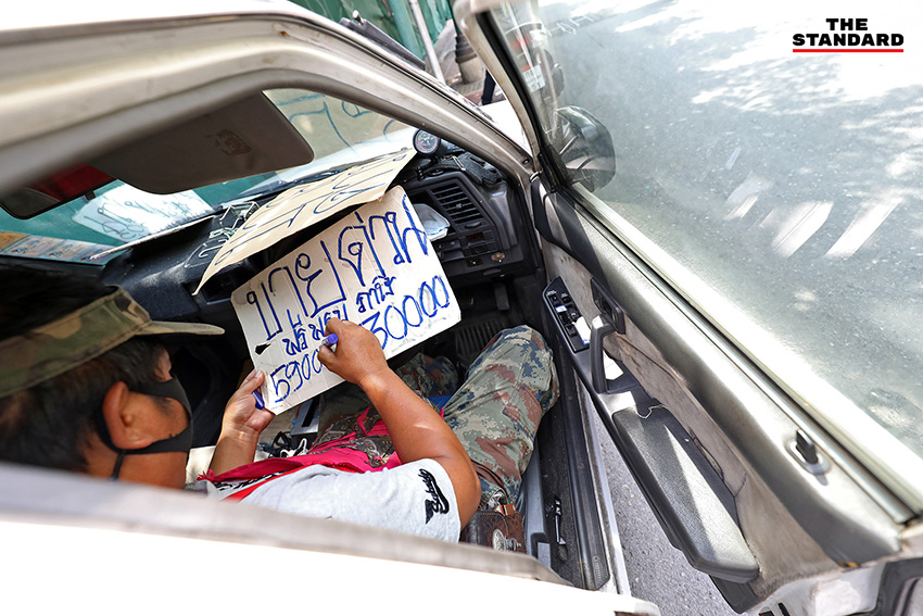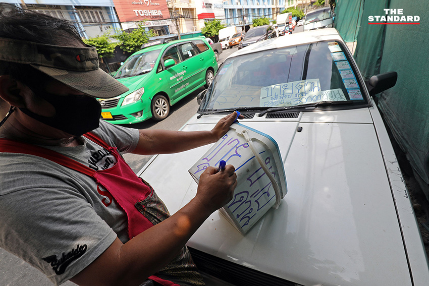 ผู้ค้าของเบ็ดเตล็ดย่านเยาวราชกำลังเขียนป้ายประกาศขายรถของตนเอง เพื่อนำเงินมาหมุนเวียนในการขายของและจุนเจือครอบครัว ท่ามกลางการระบาดระลอกล่าสุด