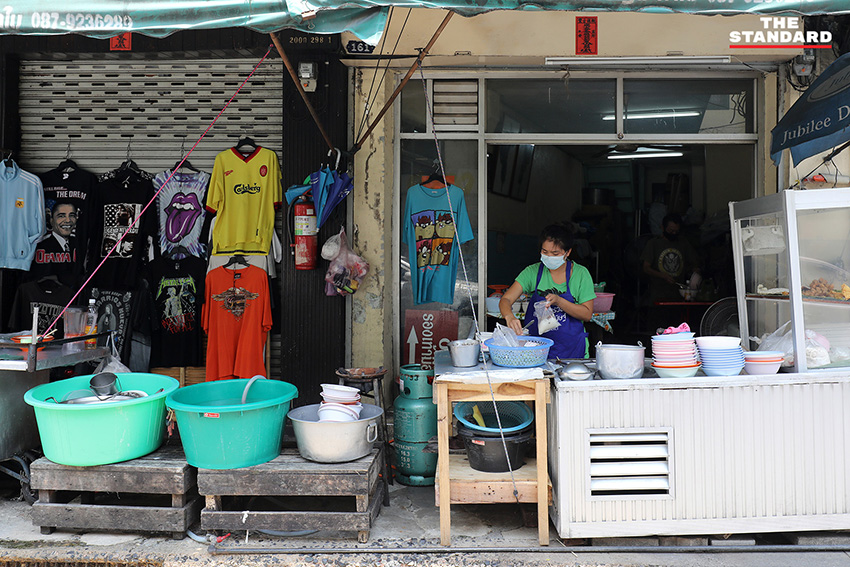 แม่ค้าขายก๋วยเตี๋ยวย่านเจริญกรุงนำเสื้อยืดมาขายบริเวณร้านของตนเอง เพื่อเสริมรายได้จากการที่ยอดขายก๋วยเตี๋ยวลดลง เนื่องจากผลกระทบของการระบาดของโรคโควิด-19