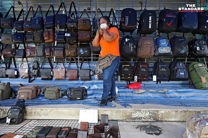 แม่ค้าขายกระเป๋าย่านวงเวียนใหญ่ยืนคอยลูกค้า ซึ่งร้านของตนเข้าร่วมโครงการเราชนะ รายรับเลยยังพอไปได้ แต่พอโครงการหมด ลูกค้าก็เริ่มลดลง