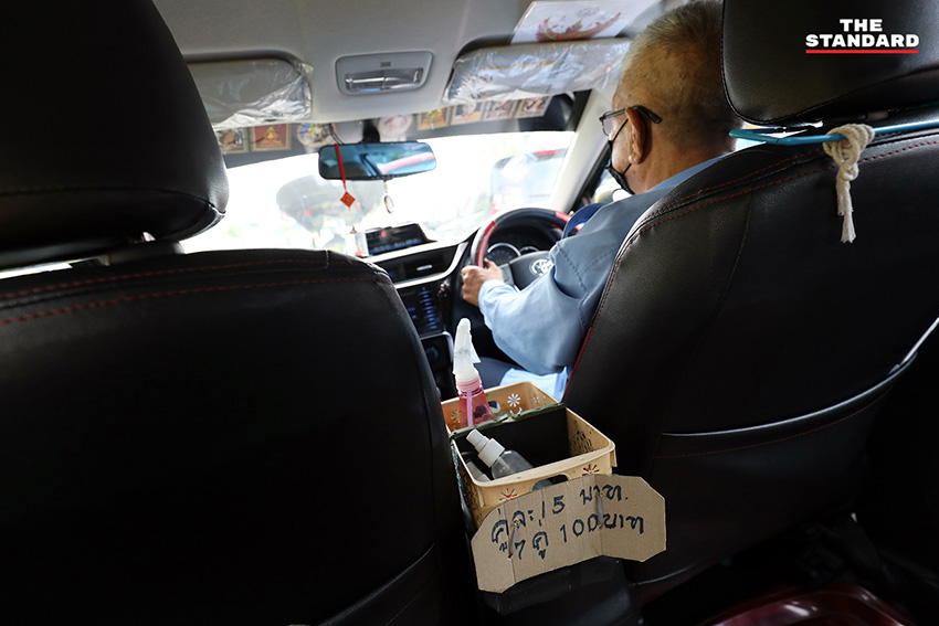 ผู้ขับแท็กซี่ตั้งวางกล่องที่เคยนำถุงเท้ามาขายเพื่อเสริมรายได้ แต่หลังจากการแพร่ระบาดระลอกล่าสุด จึงตัดสินใจไม่นำของมาขายต่อ