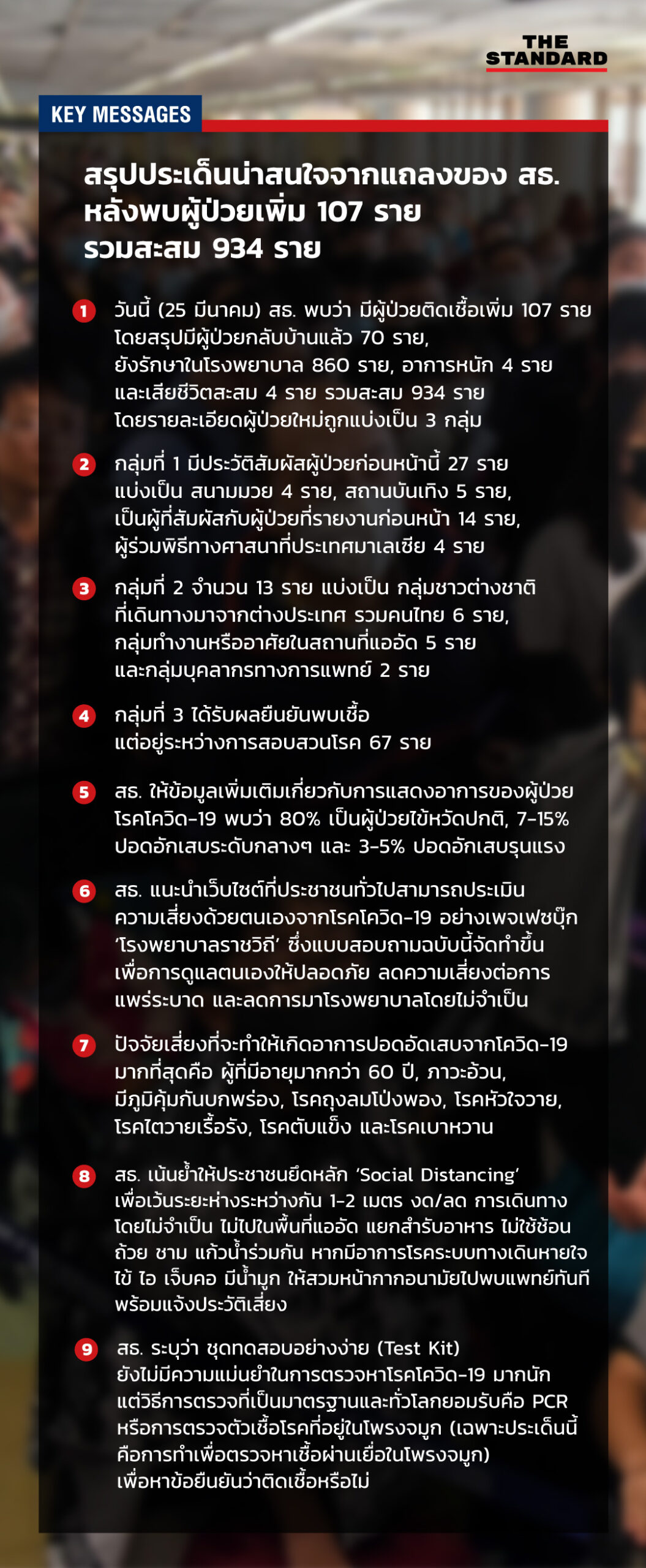 สถานการณ์การแพร่ระบาดของโควิด-19 ยังส่งผลให้ยอดผู้ติดเชื้อทั่วโลกเพิ่มขึ้นต่อเนื่อง รวมถึงประเทศไทย ที่ล่าสุดพบผู้ติดเชื้อเพิ่มภายในวันเดียว 107 ราย ทำให้ตอนนี้มีผู้ป่วยยืนยันที่รักษาหายแล้ว 70 ราย ยังรักษาตัวอยู่ในโรงพยาบาล 860 ราย แยกเป็นอาการหนัก 4 ราย เสียชีวิต 4 ราย รวมผู้ป่วยสะสมทั้งหมด 934 ราย