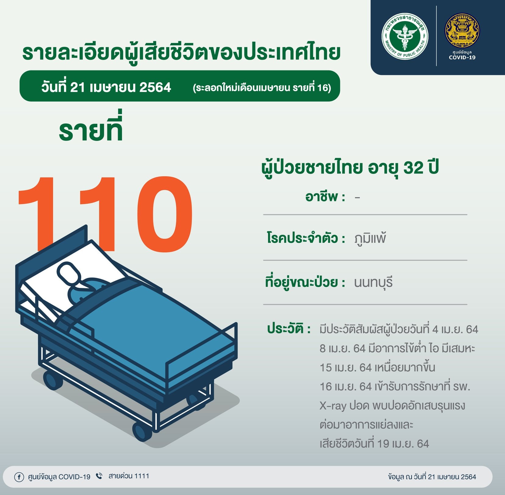 อย่างไรก็ตาม มีข้อสังเกตจากประวัติผู้เสียชีวิตบางรายที่น่าตกใจ เช่น ผู้เสียชีวิตรายที่ 110 อายุเพียง 32 ปี มีโรคประจำตัวคือภูมิแพ้ มีประวัติสัมผัสผู้ป่วยก่อนหน้าเมื่อวันที่ 4 เมษายน ถัดไป 4 วัน 8 เมษายน เริ่มมีอาการไข้ ไอ ต่อมาผ่านไปหนึ่งสัปดาห์อาการทรุดหนัก ปอดอักเสบรุนแรง และเสียชีวิตในวันที่ 19 เมษายน โดยครอบครัว แจ้งว่า แพทย์ลงความเห็นว่าเนื้อปอดเสียหายอย่างมาก