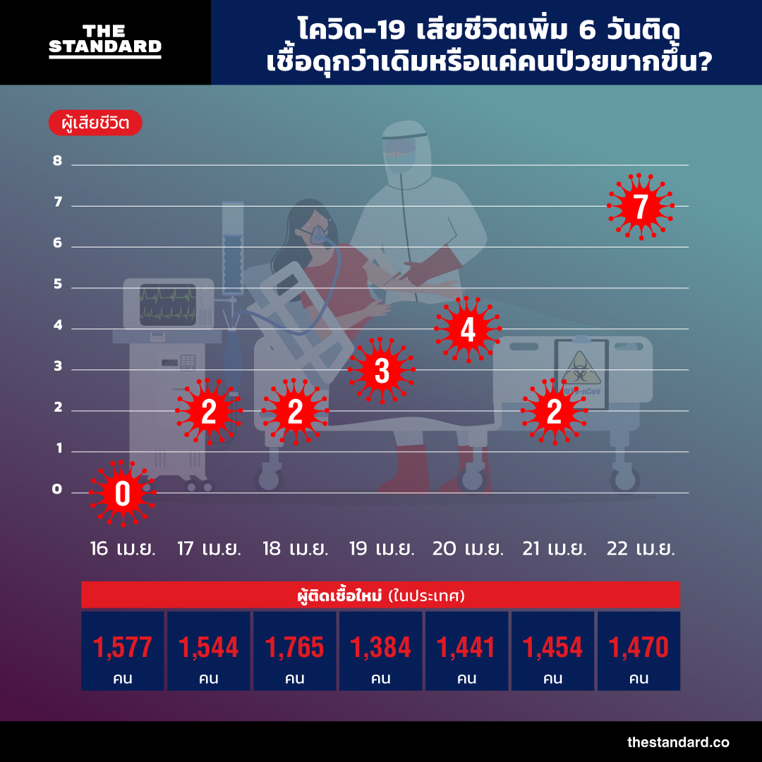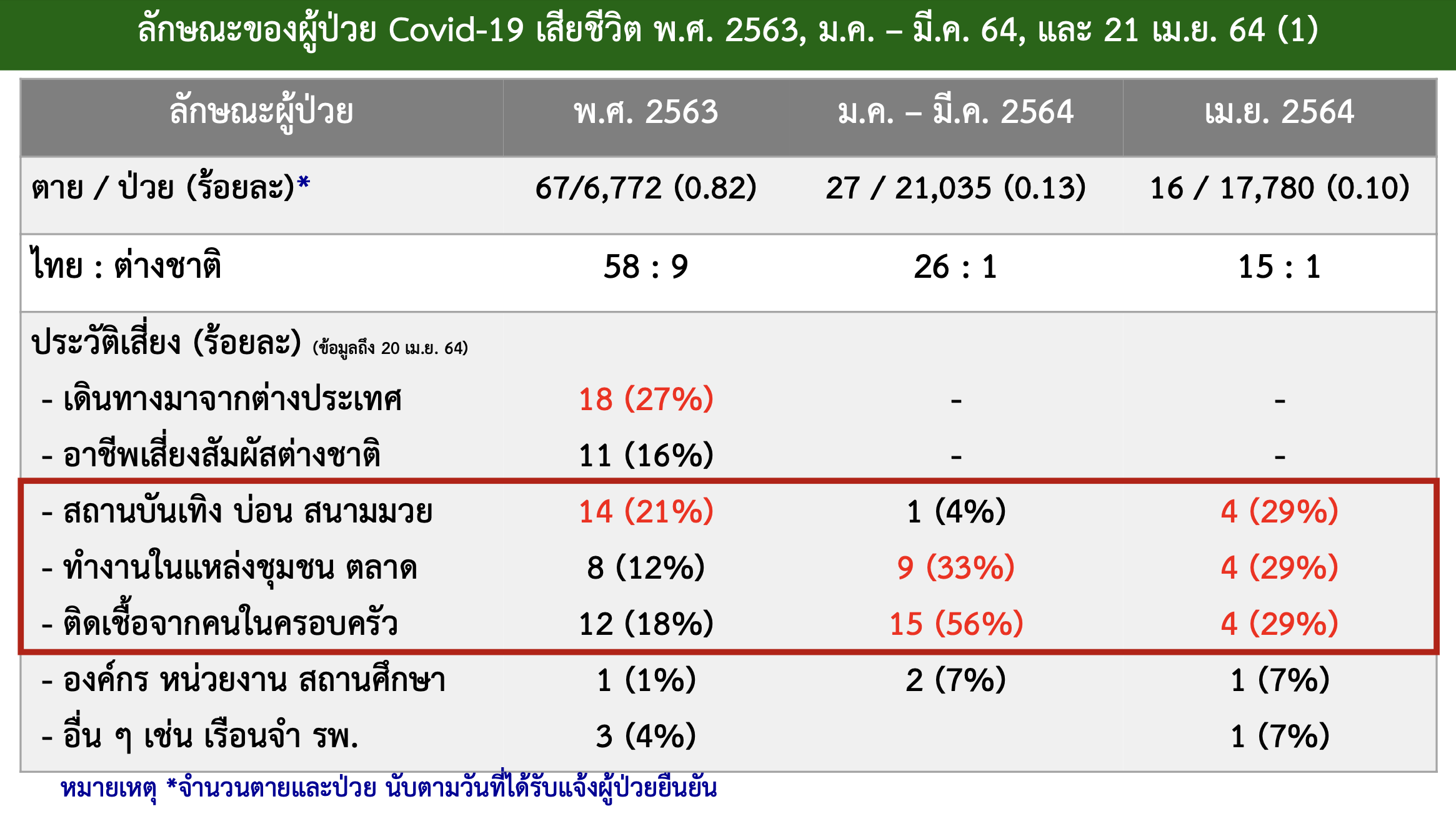 ส่วนการระบาดรอบล่าสุดในช่วงเดือนเมษายน 2564 ตัวเลขในตารางของ ศบค. ไม่อัปเดตตามสถานการณ์ เพราะนับถึงแค่วันที่ 21 เมษายน แต่นับจนถึงปัจจุบัน วันที่ 22 เมษายน ที่มีผู้เสียชีวิตสูงสุดวันเดียว 7 คน อัตราการเสียชีวิตจะอยู่ที่ 0.12% ซึ่งหากดูตัวเลขนี้ ศบค. พยายามสื่อสารให้เห็นว่า เชื้อโควิด-19 สายพันธุ์อังกฤษ B117 ที่ระบาดในรอบนี้ไม่ได้รุนแรงหรือดุขึ้น เพียงแต่มันแพร่เชื้อได้เร็วขึ้นเท่านั้น
