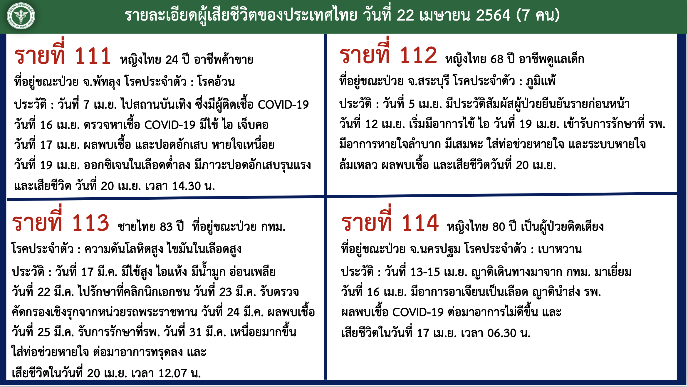 แม้กระทั่งผู้เสียชีวิตล่าสุดวันนี้ รายที่ 111 เป็นเพศหญิง อายุเพียง 24 ปี เป็นโรคอ้วน ไปสถานบันเทิงที่มีผู้ติดเชื้อ 7 เมษายน ผ่านไปหนึ่งสัปดาห์เริ่มมีอาการ และไปตรวจหาเชื้อวันที่ 16 เมษายน ถัดไป 3 วันอาการทรุดหนัก และเสียชีวิตในวันที่ 20 เมษายน