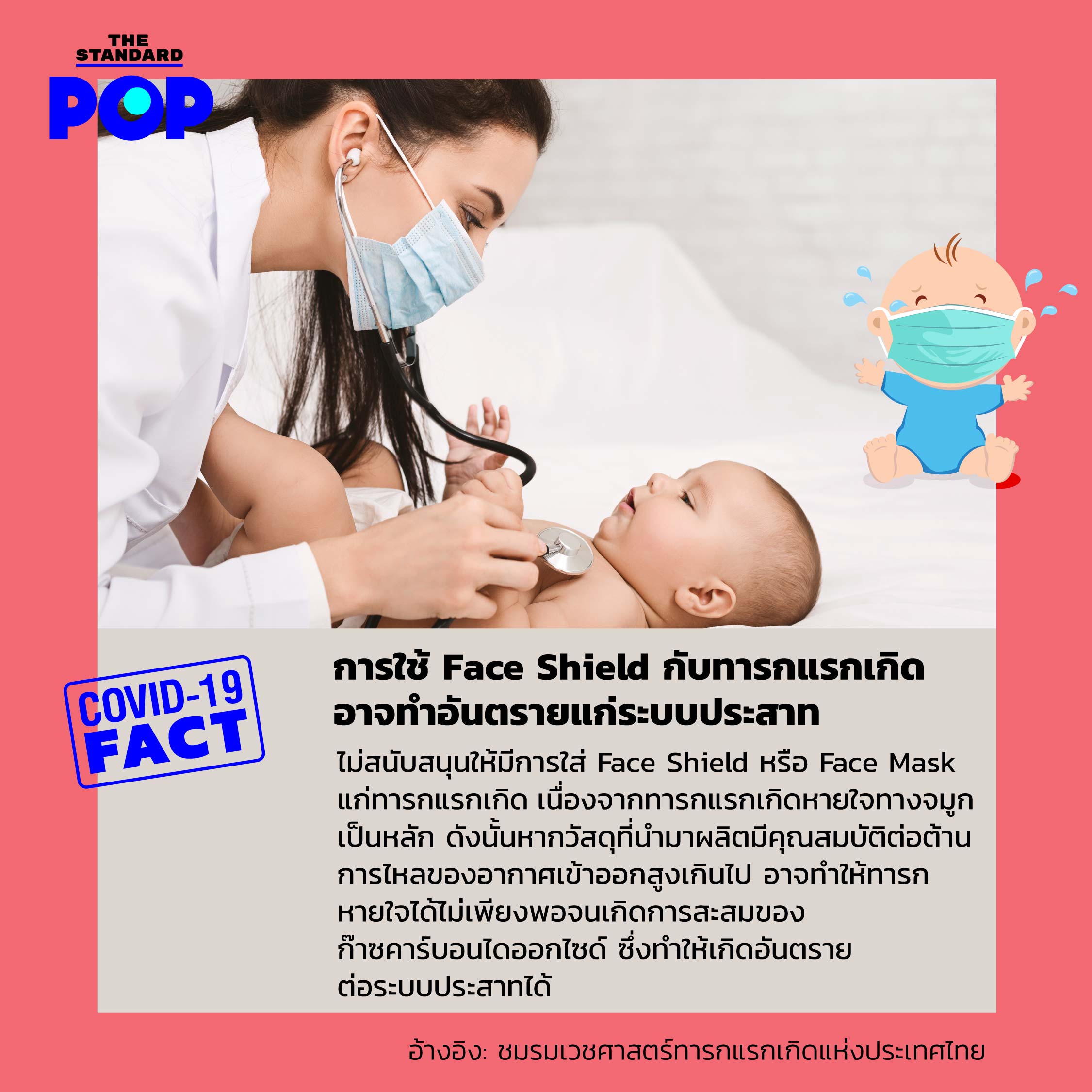 จากประเด็นที่มีภาพโรงพยาบาลและผู้ปกครองหลายคนใส่ Face Shield หรือ Face Mask ให้แก่ทารกแรกเกิดเพื่อป้องกันการติดเชื้อโควิด-19 ชมรมเวชศาสตร์ทารกแรกเกิดแห่งประเทศไทยกลับออกประกาศว่าไม่สนับสนุนให้มีการใส่ Face Shield หรือ Face Mask แก่ทารกแรกเกิด เพราะอาจทำอันตรายต่อระบบประสาทของทารกได้