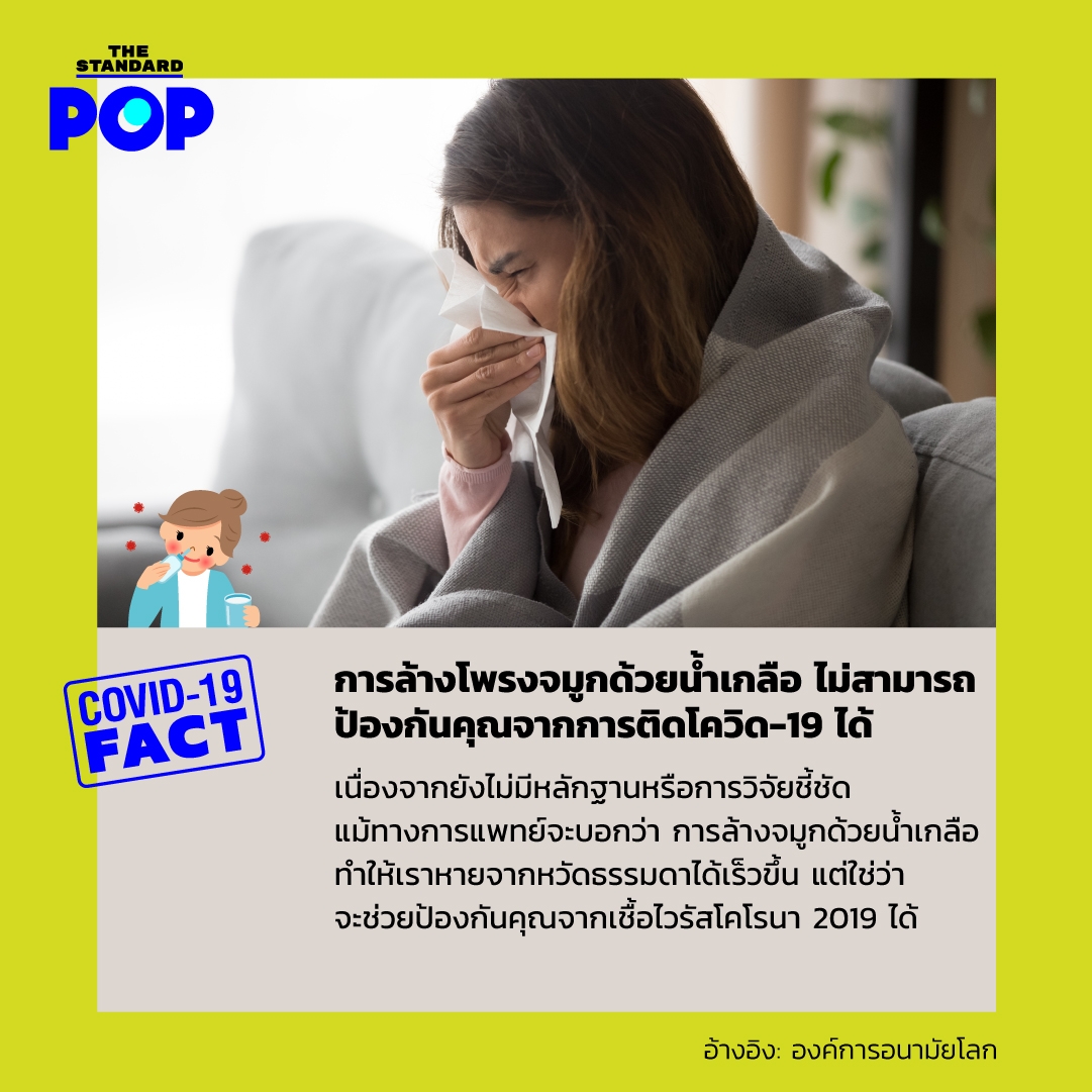 ประเด็นนี้ องค์การอนามัยโลกบอกว่า การล้างโพรงจมูกด้วยน้ำเกลือไม่สามารถป้องกันคุณจากการติดโควิด-19 ได้ เนื่องจากยังไม่มีหลักฐานหรือการวิจัยชี้ชัด แม้ทางการแพทย์จะบอกว่า การล้างจมูกด้วยน้ำเกลือทำให้เราหายจากหวัดธรรมดาได้เร็วขึ้น แต่ใช่ว่าจะช่วยป้องกันคุณจากเชื้อไวรัสโคโรนา 2019 ได้