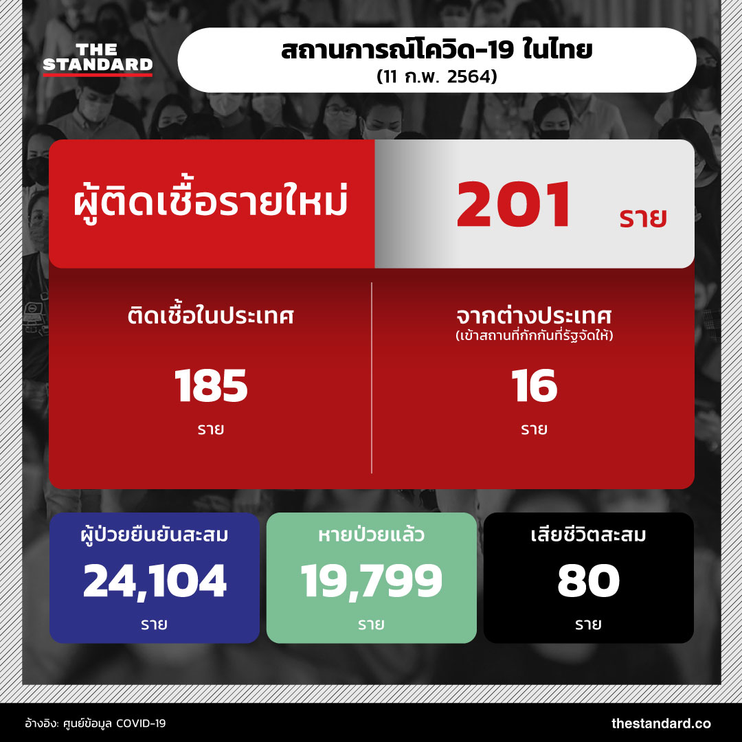 วันนี้ (11 กุมภาพันธ์) สถานการณ์โควิด-19 ในประเทศไทย พบผู้ป่วยรายใหม่เพิ่ม 201 ราย แบ่งเป็นติดเชื้อจากต่างประเทศ (เข้าสถานที่กักกันที่รัฐจัดให้) 16 ราย และผู้ติดเชื้อภายในประเทศ 185 ราย