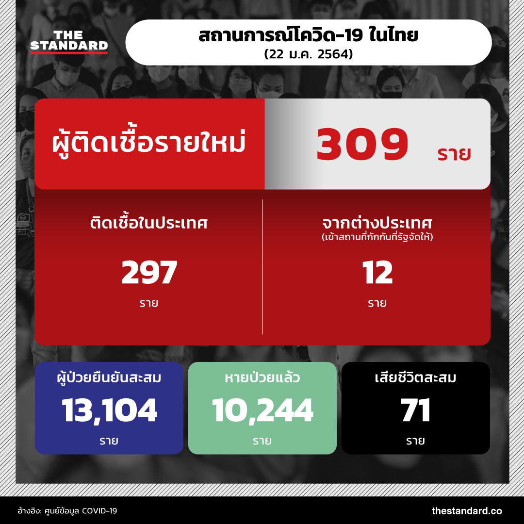 วันนี้ (22 มกราคม) สถานการณ์โควิด-19 ในประเทศไทย พบผู้ป่วยรายใหม่เพิ่ม 309 ราย แบ่งเป็นติดเชื้อจากต่างประเทศ (เข้าสถานที่กักกันที่รัฐจัดให้) 12 ราย และผู้ติดเชื้อภายในประเทศ 297 ราย
