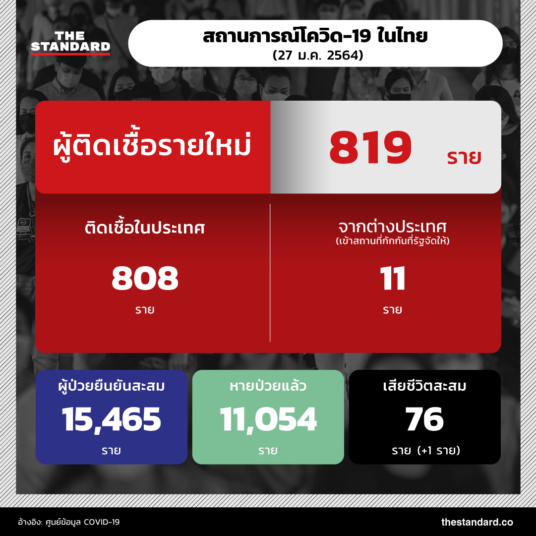 วันนี้ (27 มกราคม) สถานการณ์โควิด-19 ในประเทศไทย พบผู้ป่วยรายใหม่เพิ่ม 819 ราย แบ่งเป็นติดเชื้อจากต่างประเทศ 11 ราย และผู้ติดเชื้อภายในประเทศ 808 ราย