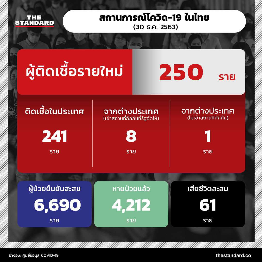 วันนี้ (30 ธันวาคม) สถานการณ์โควิด-19 ในประเทศไทย พบผู้ป่วยรายใหม่เพิ่ม 250 ราย แบ่งเป็นการตรวจพบเชื้อในสถานที่กักกันที่รัฐจัดให้ 8 ราย เดินทางเข้าประเทศโดยไม่เข้าสถานกักกัน 1 ราย และผู้ติดเชื้อภายในประเทศ 241 ราย