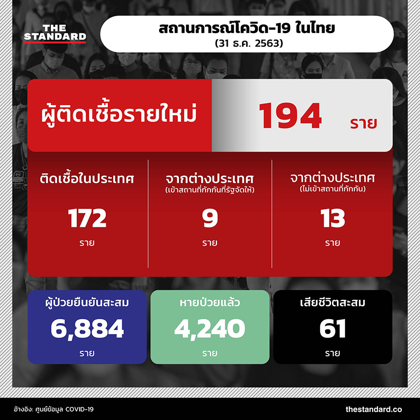 วันนี้ (31 ธันวาคม) สถานการณ์โควิด-19 ในประเทศไทย พบผู้ป่วยรายใหม่เพิ่ม 194 ราย แบ่งเป็นการตรวจพบเชื้อในสถานที่กักกันที่รัฐจัดให้ 13 ราย ติดเชื้อในแรงงานต่างด้าว (คัดกรองเชิงรุก) 9 ราย และผู้ติดเชื้อภายในประเทศ 172 ราย