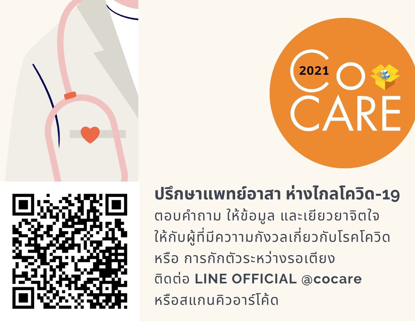 CoCare เป็นแอ็กเคานต์ LINE OA ที่รวบรวมบุคลากรการแพทย์ที่มีจิตอาสากว่า 100 ชีวิต ทั้งแพทย์ ทันตแพทย์ พยาบาล นักกายภาพบำบัด นักรังสีเทคนิค นักจิตวิทยา เภสัชกร เทคนิคการแพทย์ สหสาขา และนักวิชาการสาธารณสุข มาเพื่อให้คำแนะนำและให้คำปรึกษาประชาชนทั่วไปที่มีข้อสงสัยเกี่ยวกับโควิด-19 และการปฏิบัติตัวในช่วงโควิด-19