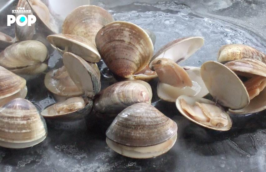 อีกหนึ่งฉากที่ทำให้เราได้เปิดโลกการกินของเกาหลีเหนือคือ ฉากที่ทุกคนกำลังกิน ‘หอยเผาและโซจู’ ที่มีกรรมวิธีการทำสุดแปลก โดยการวางหอยลงบนพื้น ราดน้ำมัน แล้วจุดไฟ เหมือนเวลาไปตั้งแคมป์ไม่มีผิด เมื่อเผาจนได้ที่แล้ว ก็หยิบถุงมือขึ้นมาใส่ แกะหอย จะกินเปล่าๆ หรือเทโซจูลงไปแล้วกินพร้อมกัน ก็จะได้รสชาติหวานๆ แปลกใหม่