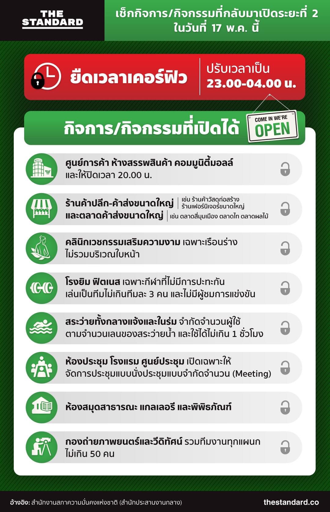 - เปิดเพิ่มร้านอาหาร-เครื่องดื่มในอาคารสำนักงาน โรงอาหาร ศูนย์อาหารภายในหน่วยงาน โดยเปิดให้ขายนำกลับไปบริโภคที่อื่น และห้ามบริโภคสุราหรือเครื่องดื่มที่มีแอลกอฮอล์ในร้าน