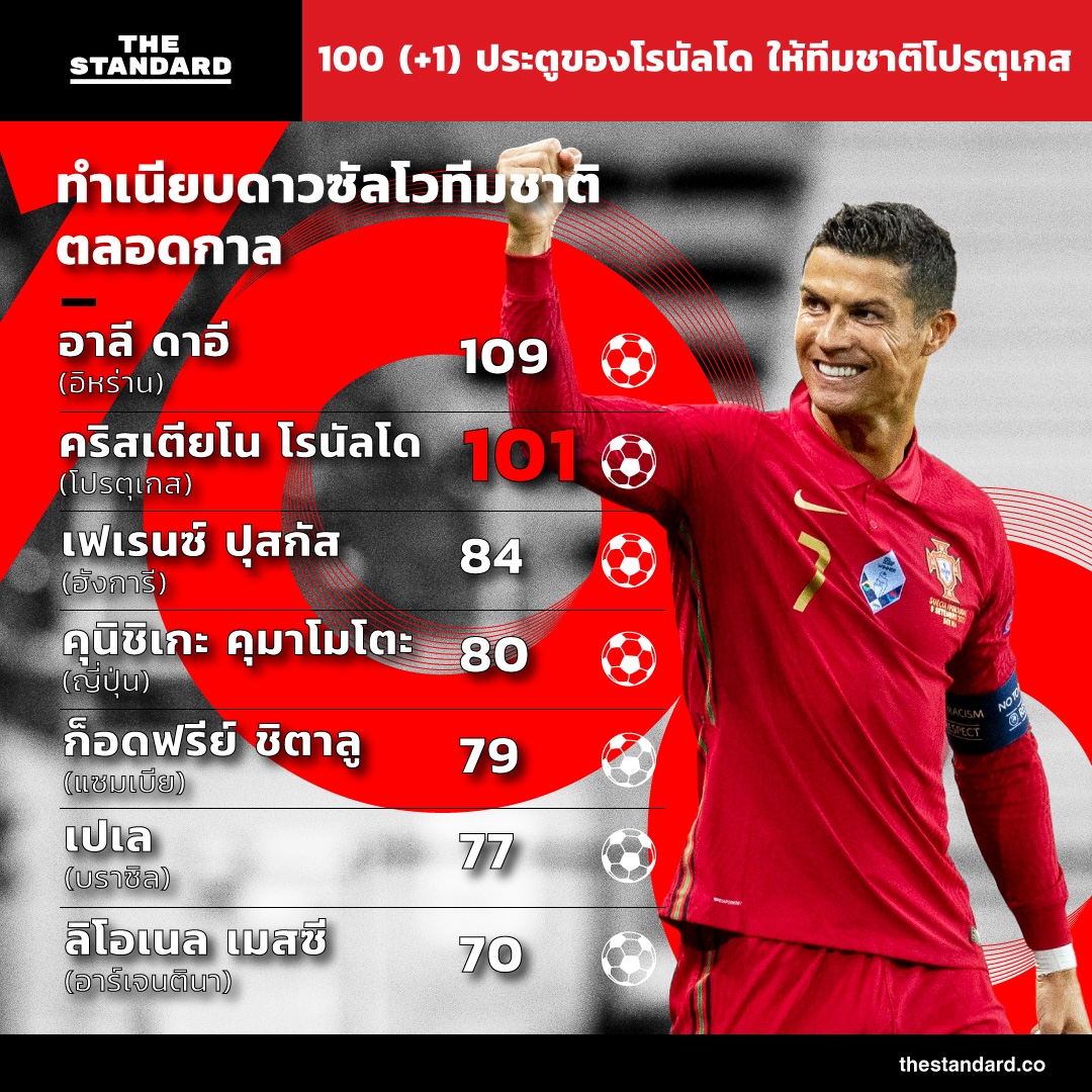 คริสเตียโน โรนัลโด กลายเป็นผู้เล่นคนที่ 2 ในประวัติศาสตร์ ที่ทำประตูในนามทีมชาติได้ครบ 100 ลูก หลังทำอีก 2 ประตูในเกมที่ทีมชาติโปรตุเกสเอาชนะสวีเดนได้ 2-0 ในเกมยูฟ่าเนชันส์ลีก เมื่อคืนวันอังคารที่ผ่านมา