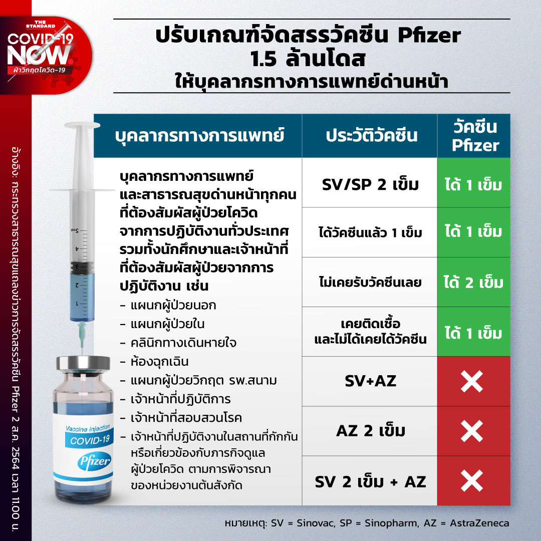 ขณะที่ นพ.โอภาส การย์กวินพงศ์ อธิบดีกรมควบคุมโรค กล่าวว่า ตามมติคณะอนุกรรมการสร้างภูมิคุ้มกันโรค ครั้งที่ 4/2564 วันที่ 1 สิงหาคม เรื่อง คำแนะนำในการให้วัคซีน Pfizer กับบุคลากรทางการแพทย์ ซึ่งจะมีหลักเกณฑ์ดังนี้
