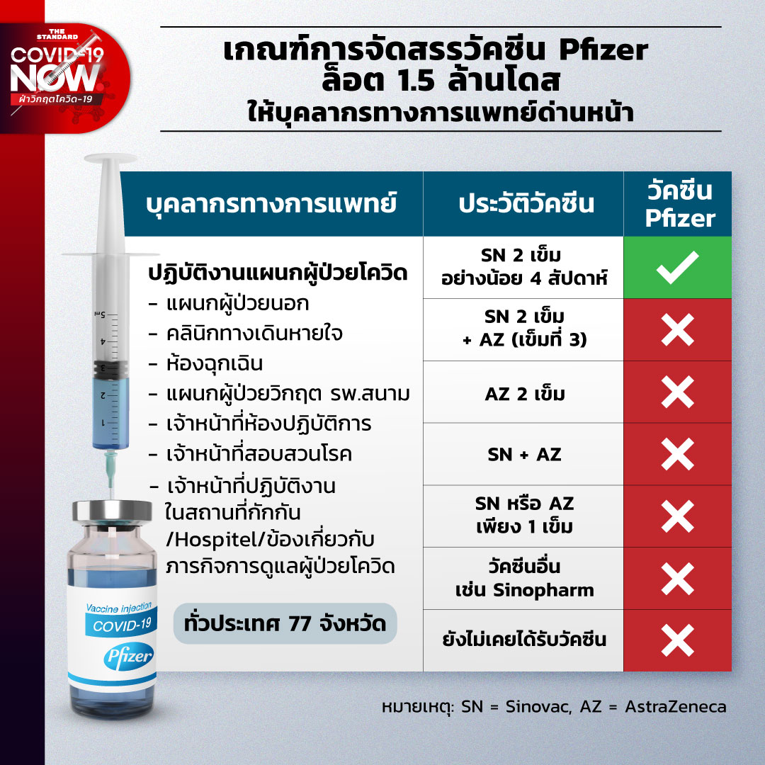 กลุ่มเป้าหมาย 4 กลุ่มหลังจะได้รับคนละ 2 โดส ห่างกัน 3 สัปดาห์คือครบตามตารางการฉีดวัคซีน ในขณะที่กลุ่มบุคลากรทางการแพทย์ด่านหน้าจะได้รับคนละ 1 โดสคือเป็นเข็ม 3 เพื่อกระตุ้นภูมิคุ้มกันเท่านั้น โดยมติการประชุมคณะทำงานฯ วันที่ 30 กรกฎาคมกำหนดเกณฑ์การจัดสรรวัคซีน Pfizer ล็อต 1.5 ล้านโดส สำหรับบุคลากรทางการแพทย์และสาธารณสุข ดังนี้