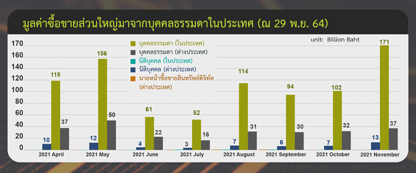 ที่น่าสนใจคือมูลค่าการซื้อขายส่วนใหญ่มาจากบุคคลธรรมดา (รายย่อย) ในประเทศ สังเกตได้จากกราฟเดือนเมษายน-พฤษภาคม ที่พุ่งขึ้นสูงกว่า 1.18 แสนล้านบาท กับ 1.56 แสนล้านบาท ขณะที่เดือนล่าสุดอย่างพฤศจิกายนก็พุ่งสูงกว่า 1.71 แสนล้านบาทด้วยกัน