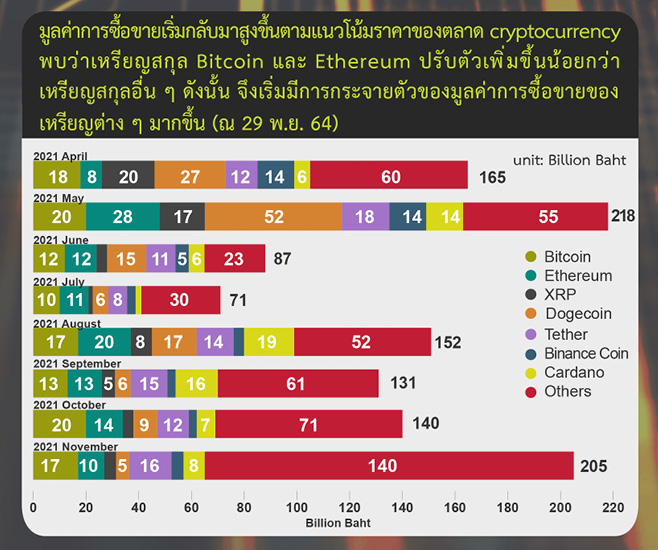 เรื่องนี้สะท้อนได้จากจำนวนมูลค่าการซื้อขายของเหรียญอื่นๆ เพิ่มขึ้นจากในเดือนเมษายน Bitcoin และ Ethereum รวมกันอยู่ที่ 2.6 หมื่นล้านบาทของการซื้อขายทั้งหมด เหรียญอื่นๆ อยู่ที่ 1.39 แสนล้านบาท แต่ในเดือนพฤศจิกายนที่ผ่านมานั้น แม้ Bitcoin และ Ethereum มีมูลค่าการซื้อขายรวม 2.7 หมื่นล้านบาท ในขณะที่เหรียญอื่นๆ มีมูลค่าการซื้อขายเพิ่มขึ้นมาเป็น 1.78 แสนล้านบาทด้วยกัน
