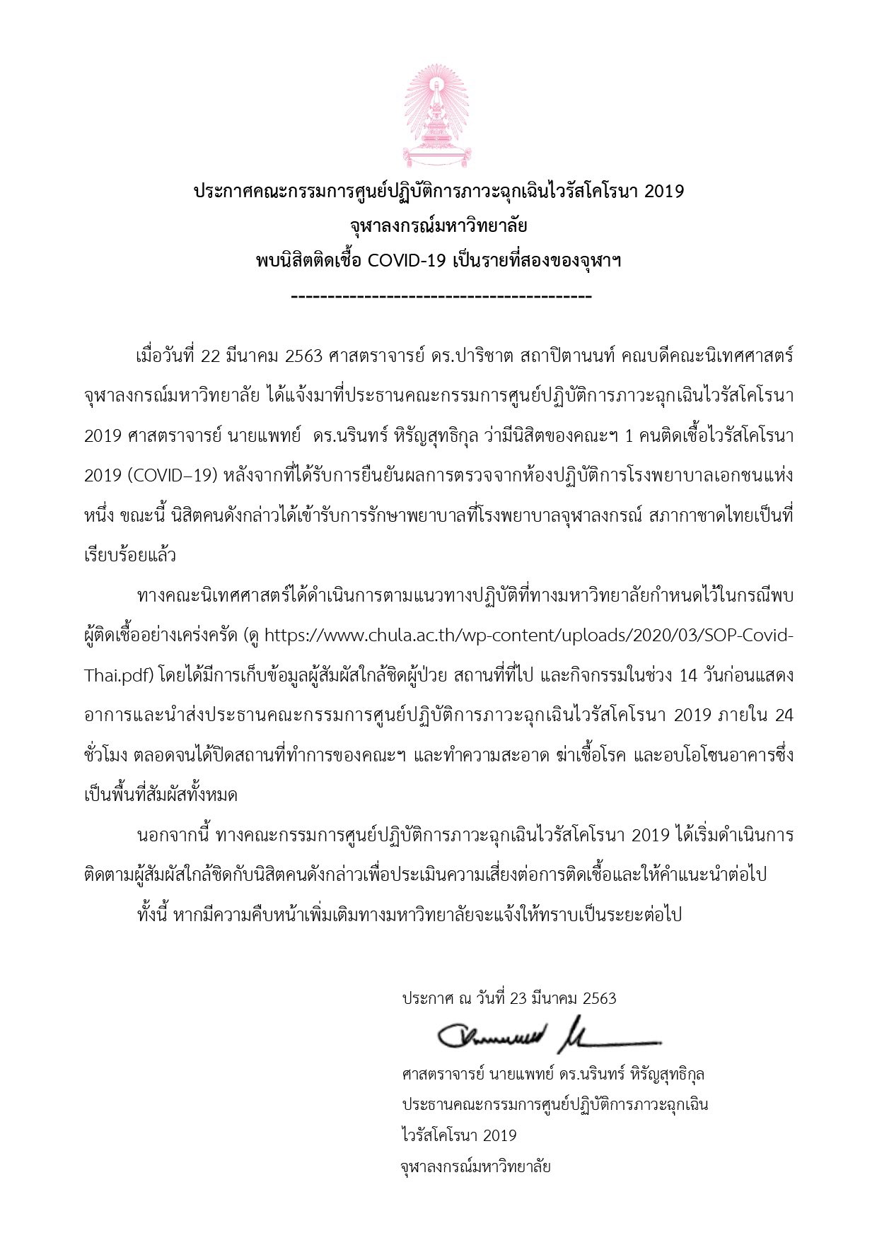ศูนย์ปฏิบัติการภาวะฉุกเฉินไวรัสโคโรนา 2019 จุฬาลงกรณ์มหาวิทยาลัย ออกประกาศแจ้งว่าพบนิสิตคณะนิเทศศาสตร์ 1 คน ติดเชื้อโควิด-19 โดยได้ทำการส่งตัวไปรักษาที่โรงพยาบาลจุฬาลงกรณ์แล้ว พร้อมสั่งปิดคณะเพื่อทำความสะอาดฆ่าเชื้อ และเร่งตามตัวคนใกล้ชิดนิสิตดังกล่าวมาประเมินความเสี่ยงต่อไป