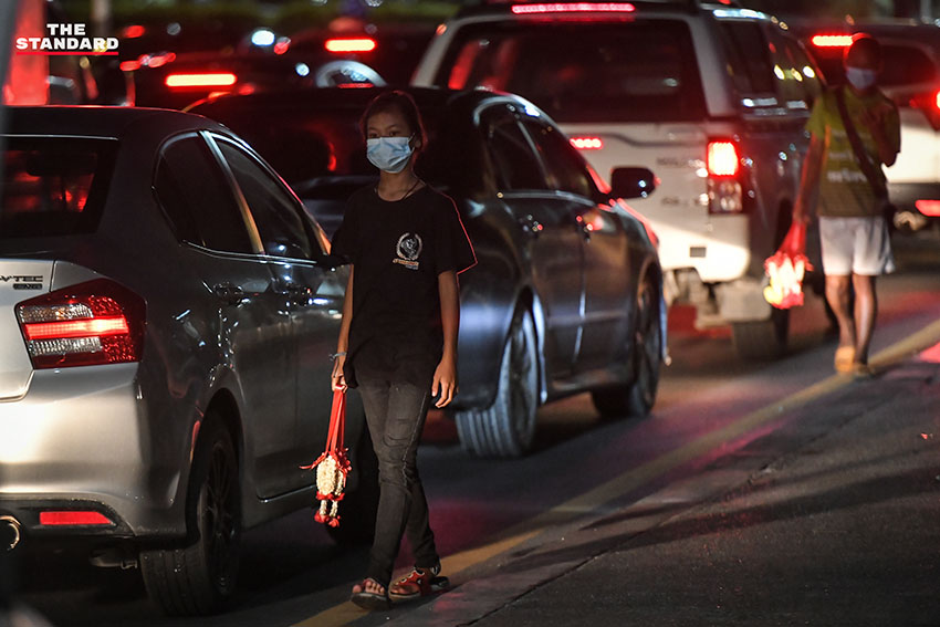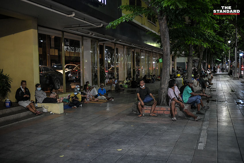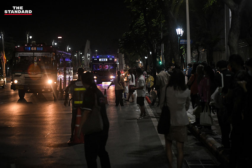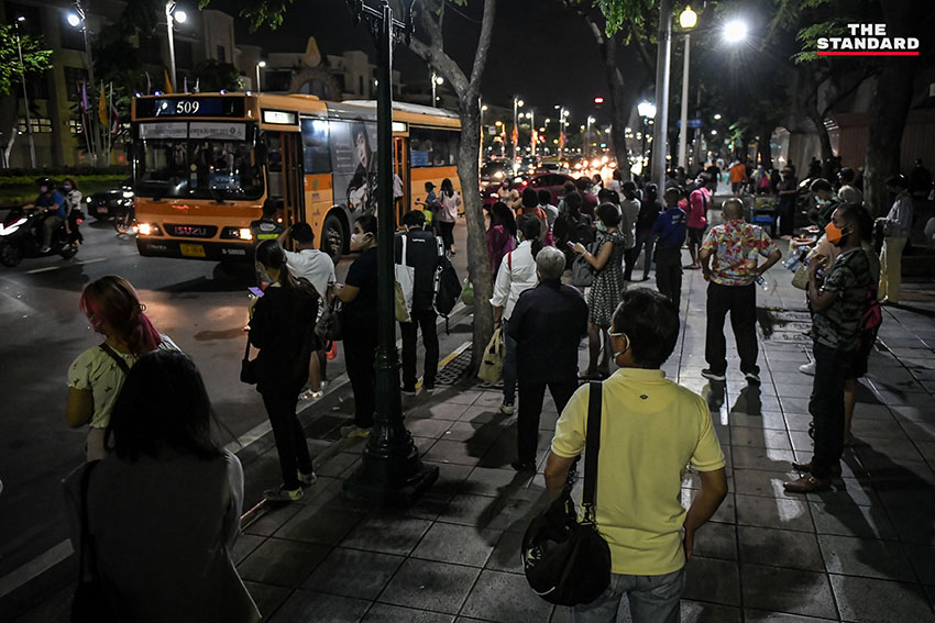 ช่างภาพ THE STANDARD ลงพื้นที่สำรวจบรรยากาศหลังเลิกงานตลอดแนวถนนราชดำเนิน ซึ่งภาพที่เห็นได้ชัดคือผู้คนที่เริ่มกลับมาใช้ชีวิต ออกมาทำงานกันตามปกติ ต่อแถวรถเมล์ยาวเหยียดเพื่อขึ้นรถเมล์ที่ค่อนข้างแออัดในช่วงเวลากลับบ้าน ท้องถนนที่เต็มไปด้วยรถยนต์อีกครั้งในช่วงเวลาแบบนี้