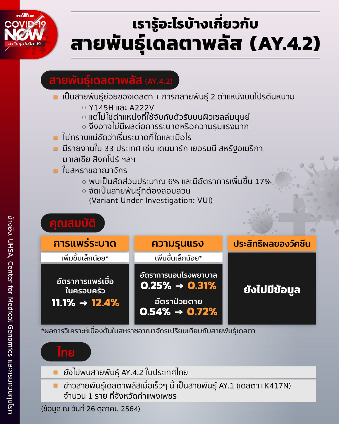 - ไทยพบผู้ป่วยโควิดสายพันธ์ุ ‘เดลตาพลัส’ 1 ราย ชี้ยังไม่น่ากังวล เฝ้าระวังอย่างต่อเนื่อง: https://thestandard.co/covid-strain-delta-plus-1st-in-thailand/