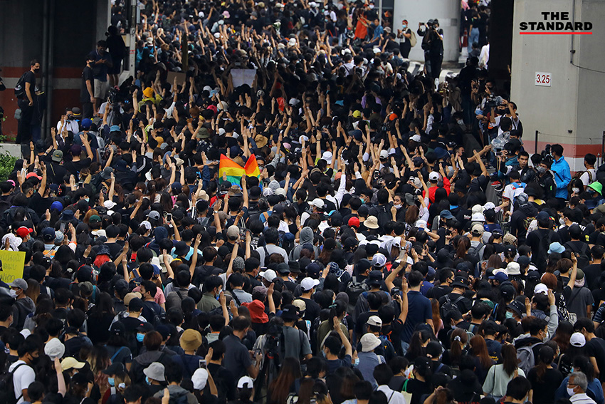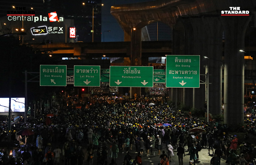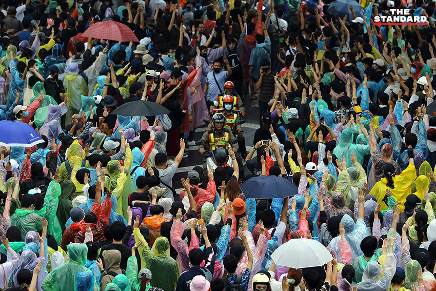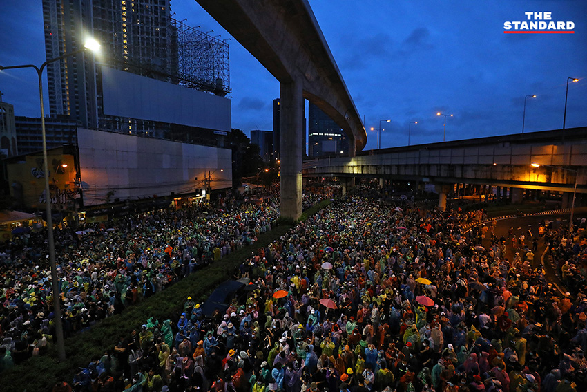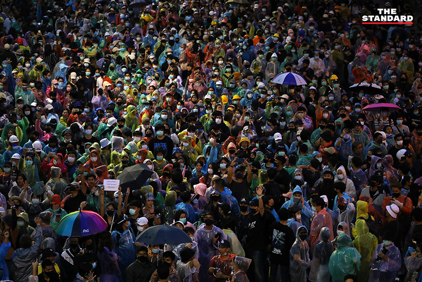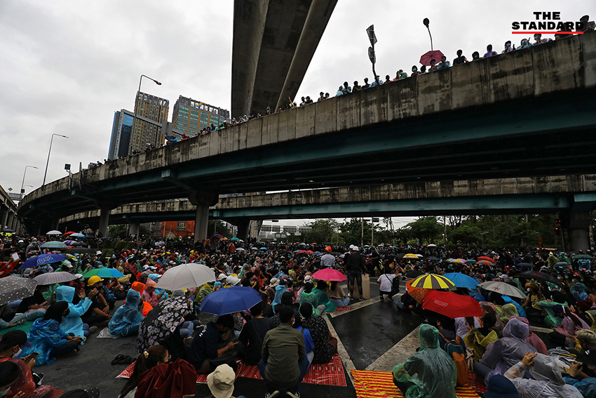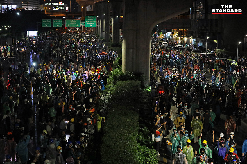 เมื่อล่วงเลยไปถึงเวลา 18.20 น. โดยประมาณ ผู้สื่อข่าวของ THE STANDARD ได้รายงานภาพบรรยากาศพบว่า มีประชาชนทยอยเข้าร่วมเต็มพื้นที่ชุมนุม และมีการแบ่งจุดนั่งและจุดยืนอย่างเป็นระเบียบ พร้อมแจกอุปกรณ์ป้องกันตัวอย่าง หมวกและหน้ากากป้องกันแก๊สน้ำตา ให้กับคนที่มาร่วมชุมนุม ท่ามกลางข่าวลือว่ามีรถฉีดน้ำแรงดันสูงที่ใช้สลายการชุมนุมที่แยกปทุมวันเมื่อคืนวานนี้จอดอยู่ใกล้พื้นชุมนุม