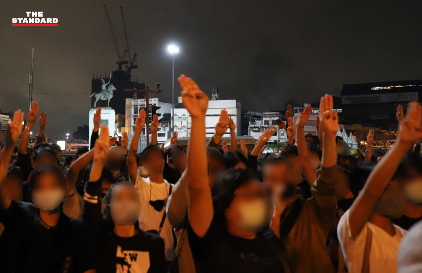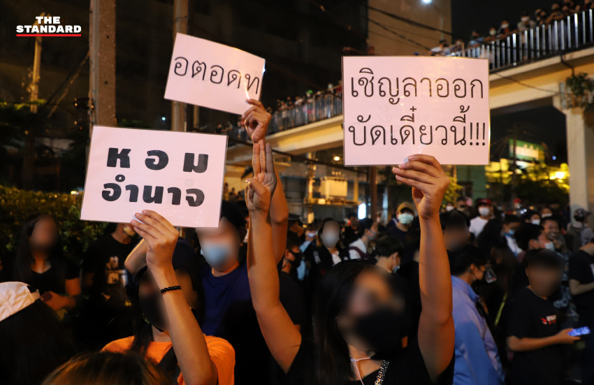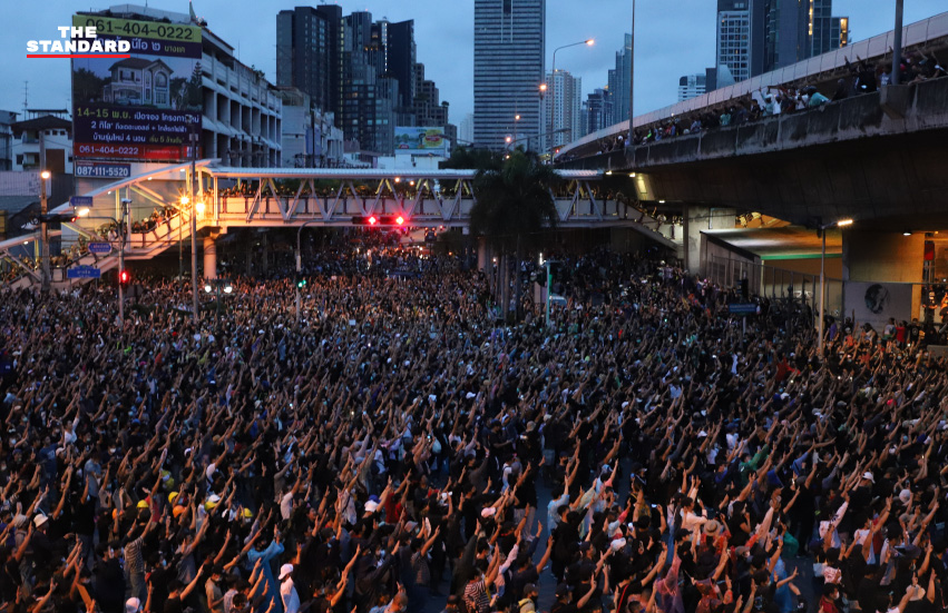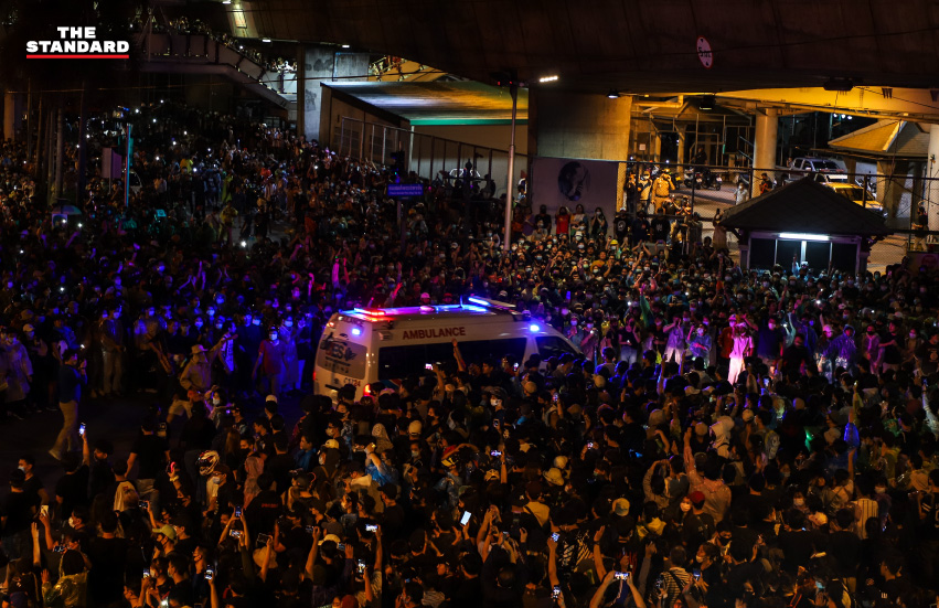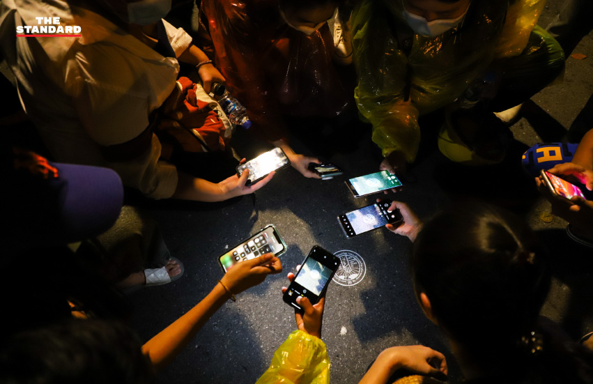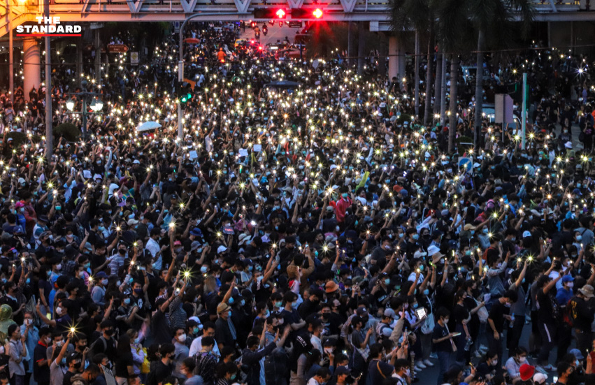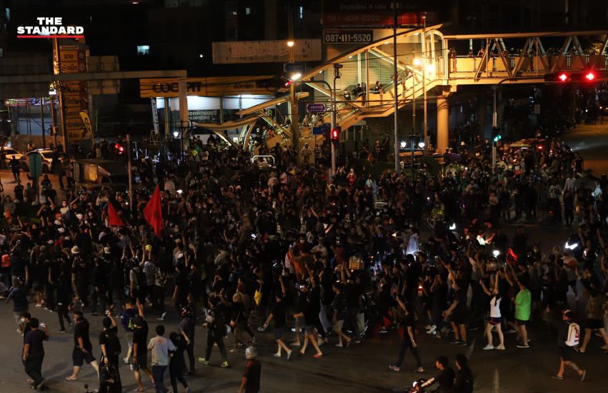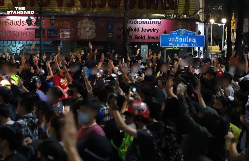 ระหว่างนั้นมีภาพเยาวชนบางส่วนยืนแจกแว่นครอบตานิรภัยให้กับมวลชนที่กำลังเดินทางไปจุดนัดพบวงเวียนใหญ่ โดยยังเกาะกลุ่มกันบริเวณเกาะกลางถนนและทางเท้า พร้อมร่วมกันตะโกนว่า “บีทีเอสเอาเปรียบประชาชน”