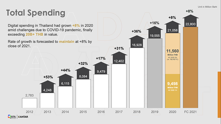 แต่ปรากฏว่า เมื่อสรุปผลรวมทั้งปีแล้วกลับพบว่า งบสื่อโฆษณาดิจิทัลในปี 2563 ตลอดปี ‘เติบโตกว่าที่คาดการณ์’ ไว้ถึง +8% มีมูลค่ารวมที่ 21,058 ล้านบาท สาเหตุหลักๆ มาจากการที่บรรดา Advertiser แบรนด์ และเอเจนซี เริ่มมีความมั่นใจในช่วงผ่านการล็อกดาวน์ของประเทศไทยที่ยอดผู้ติดเชื้อนิ่งมาโดยตลอด