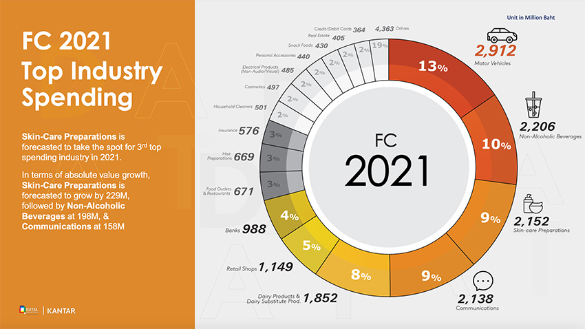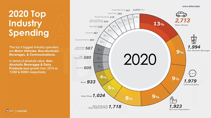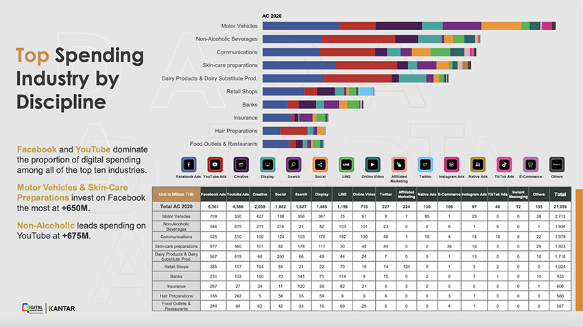 อันดับอื่นๆ ที่น่าสนใจคือ เซกเตอร์โทรคมนาคม (อันดับ 3) มีมูลค่าการใช้งบสื่อดิจิทัล 1,979 ล้านบาท เพิ่มขึ้นจากปีที่แล้ว +25% และกลุ่มสินค้าดูแลผิว มีมูลค่าการใช้งบสื่อดิจิทัล 1,923 ล้านบาท เติบโตขึ้นจากปีที่แล้ว +7%