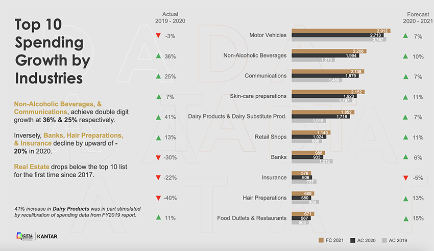 และผลิตภัณฑ์ในกลุ่มนม (Daily Products: อันดับที่ 5) ที่มีมูลค่าการใช้งบสื่อโฆษณาดิจิทัลปี 2563 ที่ผ่านมารวม 1,718 ล้านบาท เติบโตที่ระดับ +41% จากปี 2562