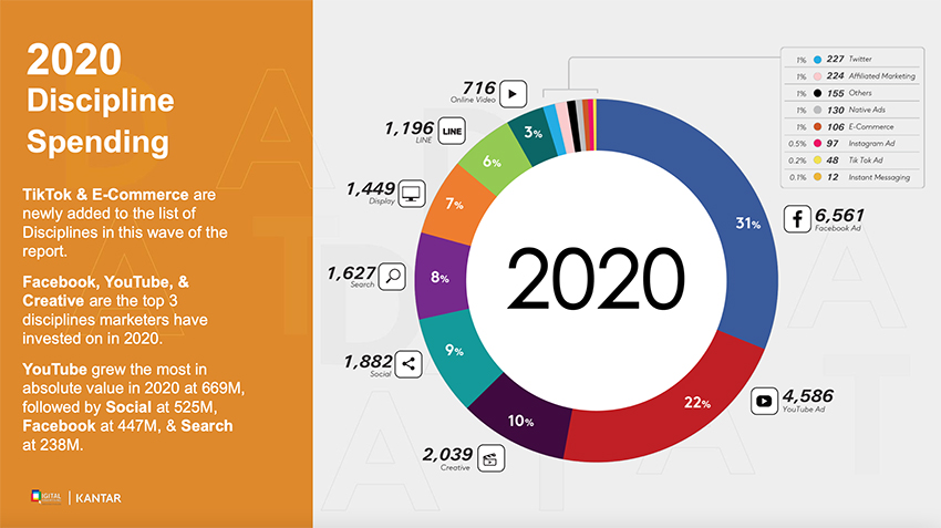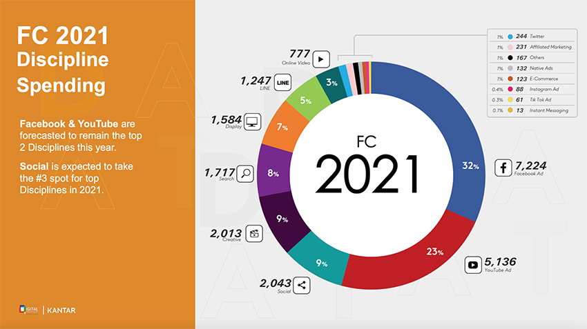 เริ่มต้นที่ Facebook Ad ซึ่งยังคงเป็นช่องทางสามัญแบบ Full Funnel เพราะเป็นแพลตฟอร์มที่แบรนด์และเอเจนซีสามารถเริ่มต้นทำได้ตั้งแต่กระบวนการสร้าง Awareness ให้แบรนด์เป็นที่รู้จัก สร้างเอ็นเกจเมนต์กับผู้บริโภค ไปจนถึงการไดรฟ์คนไปยัง E-Store อีคอมเมิร์ซ หรือปิดการขายแบบ Social Commerce ได้เบ็ดเสร็จ เรียกว่าครบเครื่อง และสามารถ Push แบรนด์ไปให้ตรงกับกลุ่มเป้าหมายจริงๆ (มูลค่ารวม 6,561 ล้านบาท +7%)