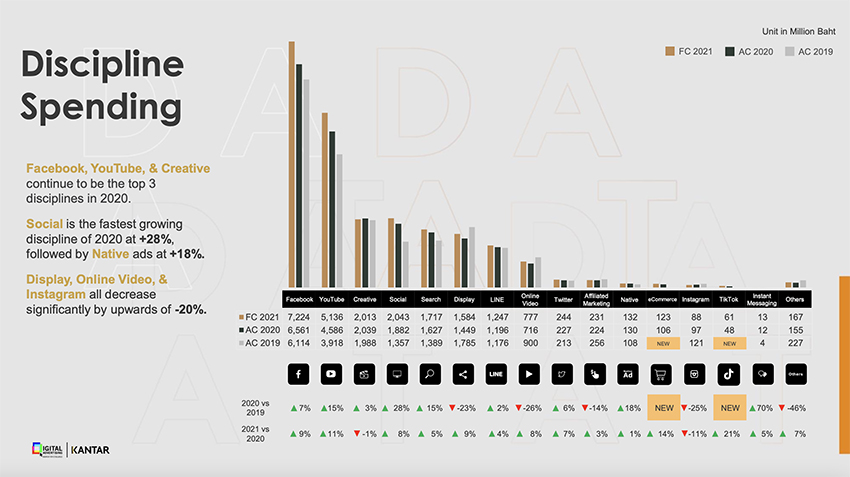 อีกประเด็นที่น่าสนใจคือ TikTok ซึ่งเป็นแพลตฟอร์มน้องใหม่ที่ปีนี้ถูก DAAT จัดเข้ามาเป็นอีกหนึ่ง Discipline ร่วมกับอีคอมเมิร์ซ โดยที่มีมูลค่าการใช้งบสื่อดิจิทัลรวม 48 ล้านบาท และ 106 ล้านบาท ตามลำดับ ซึ่ง TikTok ถือเป็นแพลตฟอร์มที่ได้รับความนิยมในกลุ่ม Gen Z เป็นอย่างมาก แบรนด์จึงพยายามสร้างคอมมูนิตี้ผ่านแพลตฟอร์มนี้ เพื่อพาตัวเองเข้าไปเป็นส่วนหนึ่งของคนรุ่นใหม่ อย่างไรก็ดี ทาง DAAT ประเมินว่า อัตราการเติบโตต่อของการใช้เม็ดเงินโฆษณาบนแพลตฟอร์มนี้ขึ้นอยู่กับว่าพวกเขาจะสามารถรักษา Active Users ให้อยู่กับตัวเองและแอ็กทีฟบนแพลตฟอร์มจริงๆ หรือมีผู้ใช้งานรายใหม่ๆ เพิ่มขึ้นมาได้หรือเปล่า (อย่าลืมว่าการขับเคี่ยวแข่งขันในแพลตฟอร์มวิดีโอตอนสั้นตอนนี้ดุเดือดมากๆ ตอนนี้ Facebook ก็เพิ่งเปิดตัว Reels ในไทยให้ใช้ได้บน Instagram เช่นเดียวกับ JOOX ที่เพิ่งเปิดตัว BUZZ)