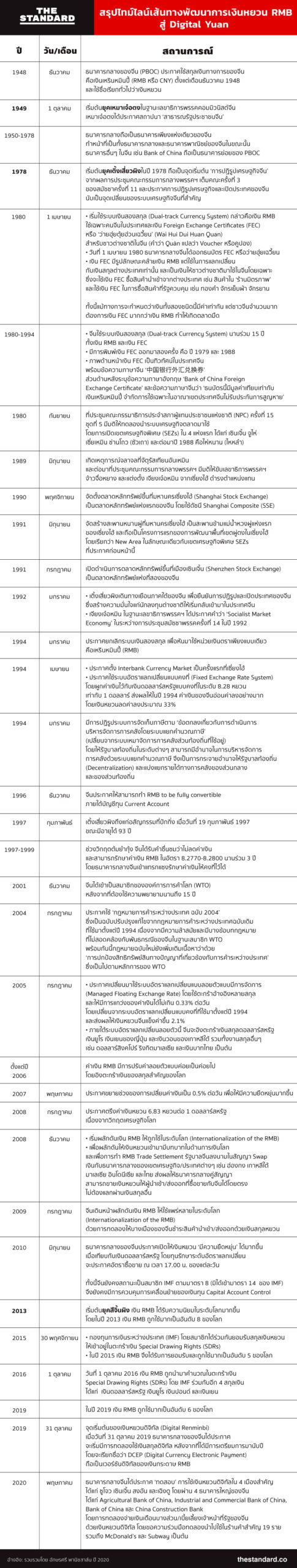 บทความนี้ได้จัดทำตารางสรุปไทม์ไลน์พัฒนาการของเงินหยวนจีน (RMB) สู่เงินหยวนดิจิทัลตั้งแต่ปี 1948-2020 เพื่อชวนให้ย้อนไปศึกษาวิเคราะห์เส้นทางเงินหยวนจีน นับจากครั้งแรกในเดือนธันวาคม ปี 1948 ที่มีการนำสกุลเงินของจีนในชื่อทางการว่า เหรินหมินปี้ (Renminbi – RMB) มาใช้ครั้งแรก โดยที่คนทั่วไปเรียกว่าเงินหยวนจีน ซึ่งจากวันนั้นมาจนถึงวันนี้เป็นเวลากว่า 70 ปี เงินหยวนของจีนมีการเปลี่ยนแปลงในแต่ละยุคสมัย
