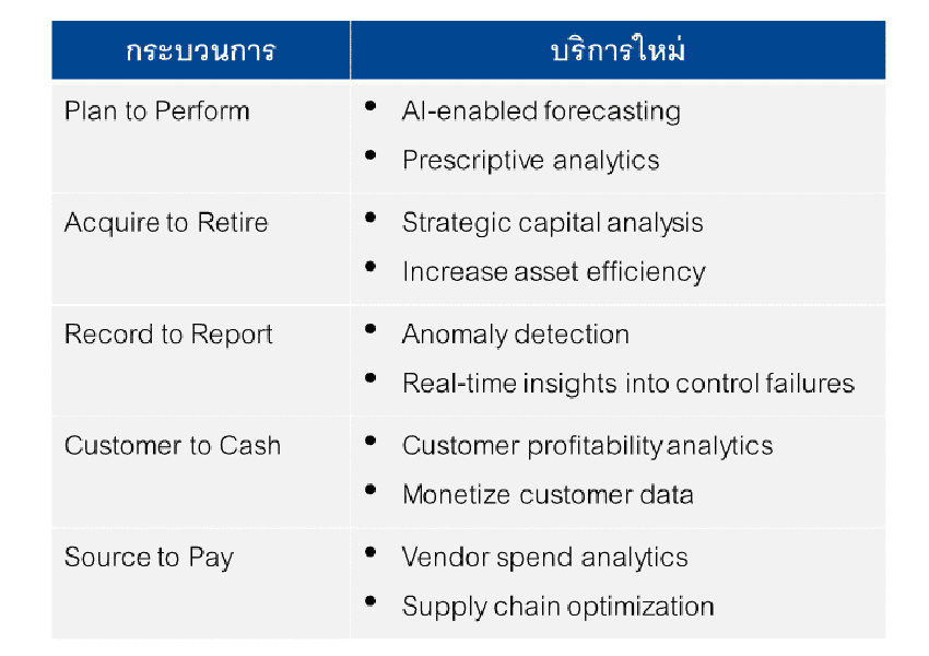 ทั้งนี้ การเปลี่ยนแปลงดังกล่าวจำเป็นต้องใช้ทักษะด้านการวิเคราะห์เชิงลึก เพื่อสร้างงานบริการใหม่ๆ ในแต่ละกระบวนการหลักทางธุรกิจ เช่น