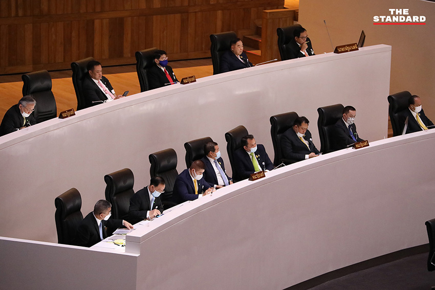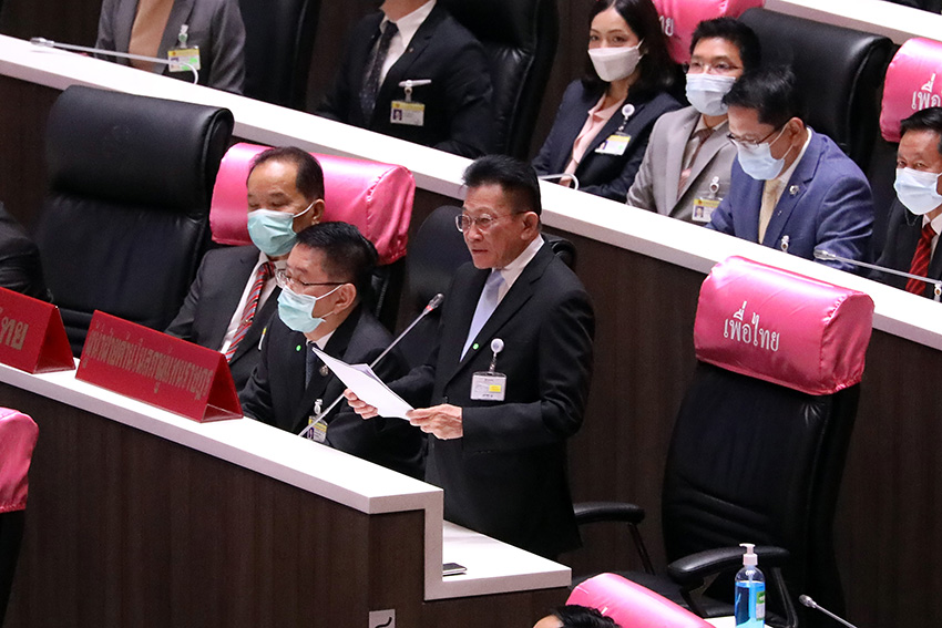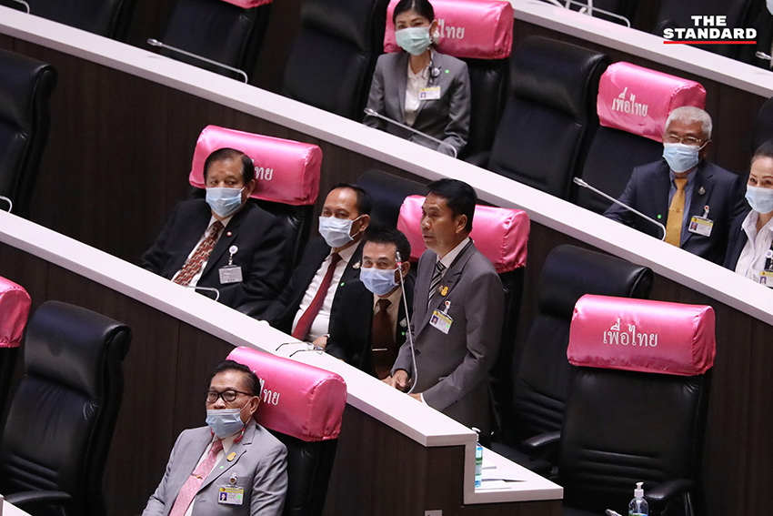 จากนั้นได้มีการสลับกันประท้วงและอภิปรายระหว่างสองฝ่าย โดยรัฐบาลยืนยันว่าจะไม่ยอมให้มีการกล่าวถึงสถาบันฯ เด็ดขาด กระทั่งในเวลา 10.45 น. สมพงษ์ อมรวิวัฒน์ หัวหน้าพรรคเพื่อไทย และผู้นำฝ่ายค้านอ่านญัตติเปิดอภิปรายไม่ไว้วางใจ ก่อนที่ใน 5 นาทีต่อมา เมื่อมีข้อความที่กล่าวถึงสถาบันฯ ไพบูลย์ นิติตะวัน ส.ส. พรรคพลังประชารัฐ ได้ลุกขึ้นประท้วงทันที ก่อนที่ชวนจะระบุว่า เป็นการอ่านตามญัตติที่อนุมัติแล้ว และดูอยู่ว่ามีข้อความเพิ่มเติมไปกว่านี้หรือไม่ จากนั้นสมพงษ์อ่านต่อ ทำให้ ปารีณา ไกรคุปต์ ส.ส. ราชบุรี พรรคพลังประชารัฐ ลุกขึ้นประท้วงว่าขัดข้อบังคับการประชุม และกล่าวถึงสถาบันฯ โดยไม่จำเป็น ก่อนที่ชวนจะระบุว่าเป็นเรื่องจำเป็น เพราะมาจากญัตติ จากนั้นสมพงษ์ อ่านต่อกระทั่งจบญัตติ ในเวลา 11.05 น.