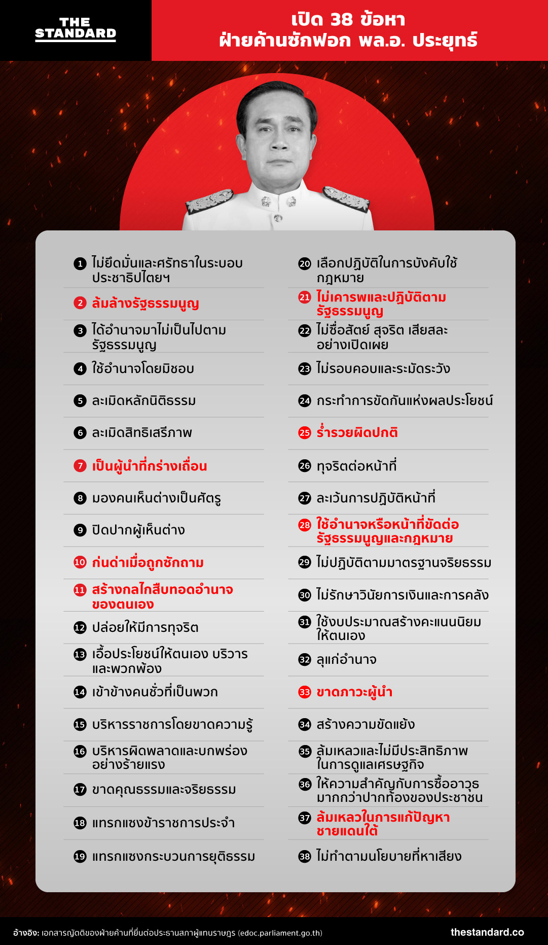 THE STANDARD เปิด 38 ข้อหา ที่ พล.อ. ประยุทธ์ ต้องเผชิญการถูกซักฟอกครั้งแรกของตนเอง