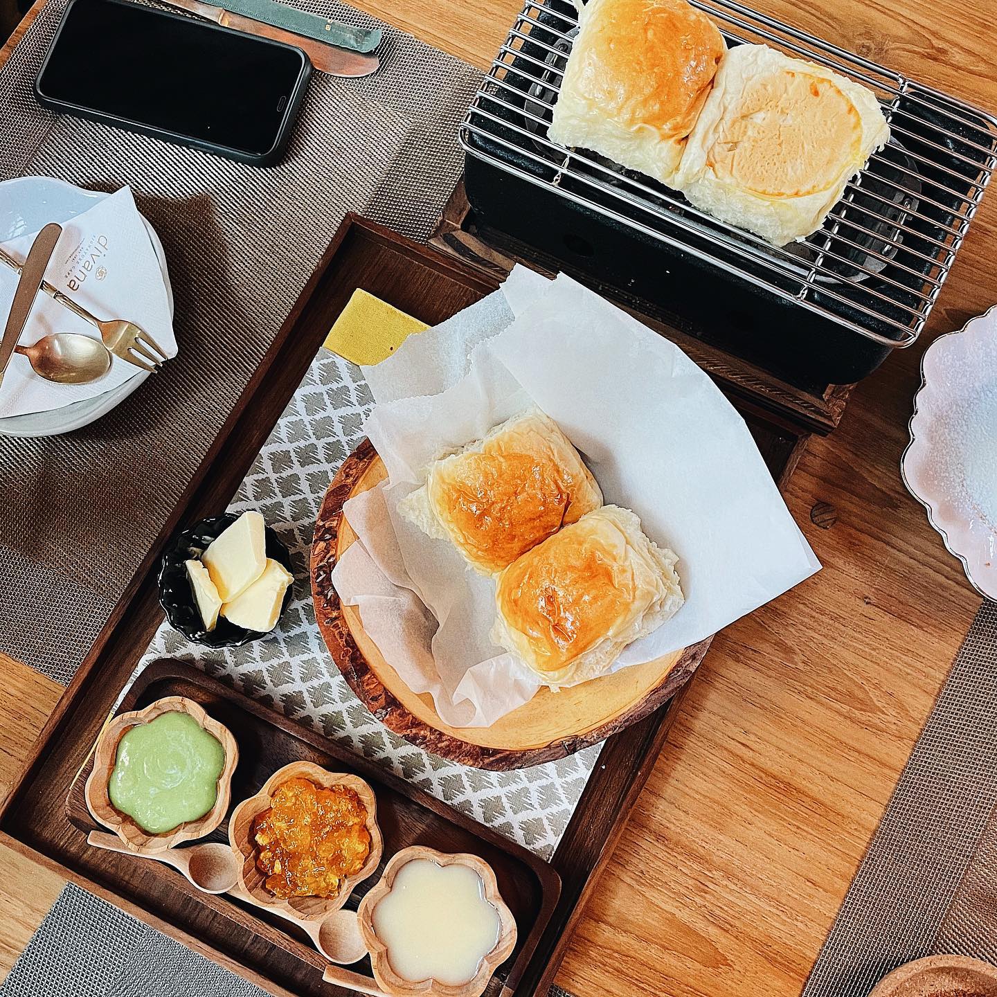 พีช-กานต์พิชชา เกียรติขจรฤทธิ์ ผู้บริหารคนสวยของ Divana Signature Cafe ได้กล่าวถึงที่มาของการครีเอตเมนู All Day Breakfast ขึ้นมาว่า “เนื่องจากที่บ้านหลังนี้ เริ่มแรกคุณน้า (ตี๋-พัฒนพงศ์ รานุรักษ์ CEO ผู้ก่อตั้ง Divana Spa และ Dii Group) อยากให้เปิดเป็นคาเฟ่เหมือนกัน ก็มีการปรึกษากันว่าแล้วจะขายอะไร ซึ่งตอนแรกภาพในหัวของพีชไม่ได้เห็นเป็นร้านอาหาร พีชเห็นภาพเป็นเชฟส์เทเบิลมากกว่า ด้วยบรรยากาศธรรมชาติที่ดูเป็นส่วนตัว แต่กลับรู้สึกว่าเชฟส์เทเบิลอาจจะยากไปนิดหนึ่ง ด้วยสถานการณ์และอะไรหลายๆ อย่าง และเราสังเกตว่าแถวๆ นี้มีร้านอาหารที่เป็นไฟน์ไดนิ่งเยอะมากเหมือนกัน เลยอยากหาอะไรง่ายๆ แล้วพอดีบ้านหลังนี้อยู่ในซอยสมคิดด้วย เราจินตนาการไปได้ว่าถ้าเราตื่นมาตอนเช้าในบ้านที่มีบรรยากาศแบบนี้ เราคงอยากกินอะไรที่ดูธรรมดา และดูโลคัลมากๆ ก็เลยกลับมาคิดว่า แต่ก่อนเราตื่นมาแล้วเราชอบอะไรที่กินได้ง่ายๆ ก็นึกถึงภาพของขนมปัง แต่ไม่อยากกินขนมปังฝรั่ง ต้องการขนมปังแบบไทยๆ แบบปิ้งเตาถ่าน แล้วก็มีไข่กระทะ มันมาจากความคิดแค่นี้เลย