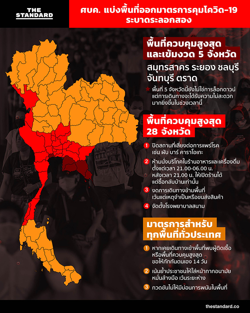นอกจากนี้ ยังมีพื้นที่ควบคุมสูงสุดและเข้มงวด 5 จังหวัด ได้แก่ สมุทรสาคร ระยอง ชลบุรี จันทบุรี ตราด