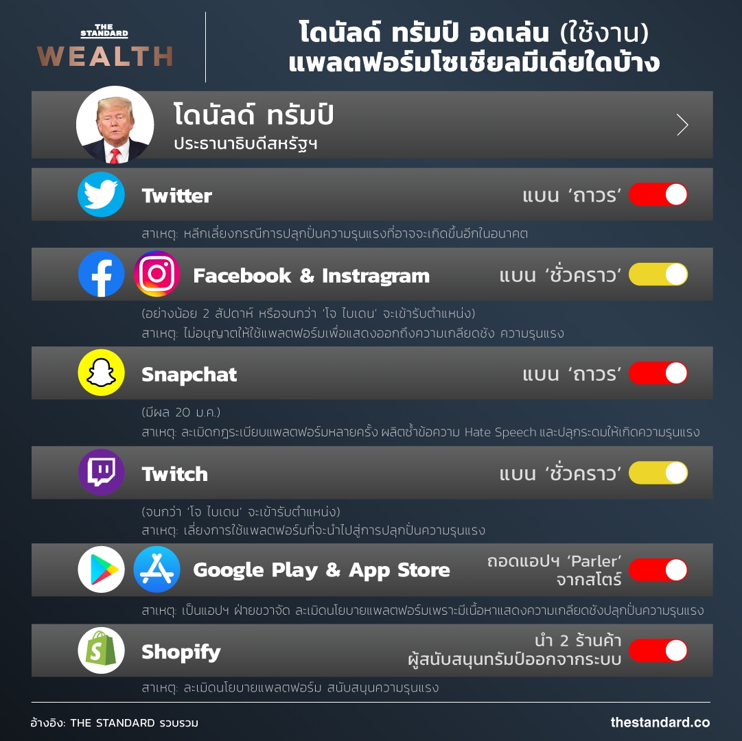หลังเกิดเหตุการณ์ผู้ชุมนุมประท้วงกลุ่มขวาจัดที่สนับสนุน โดนัลด์ ทรัมป์ บุกสร้างความวุ่นวายในอาคารรัฐสภาสหรัฐฯ ตั้งแต่วันที่ 6 มกราคมที่ผ่านมา จนมีผู้เสียชีวิต 5 ราย แพลตฟอร์มโซเชียลมีเดียเจ้าต่างๆ ก็ออกมาขยับตัว ยุติบัญชีการใช้งานของทรัมป์ตามเงื่อนไข เพื่อเลี่ยงการส่งต่อ Hate Speech และการปลุกปั่นความรุนแรง