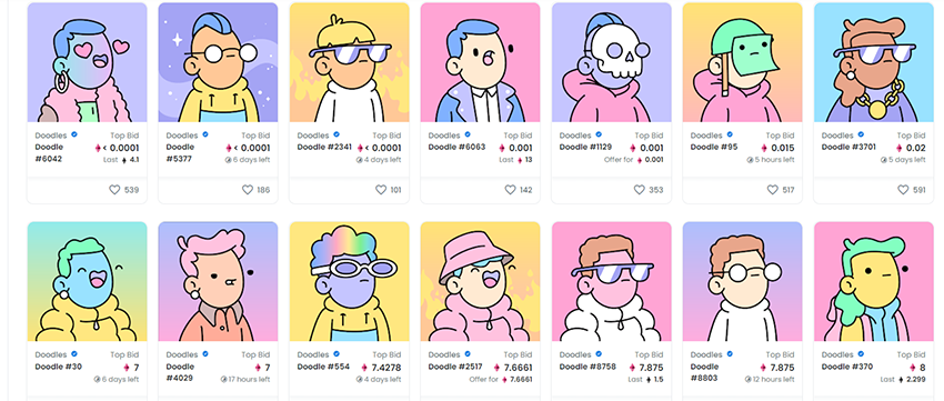 Doodles เป็นผลงาน NFTs ของ Burnt Toast หรือชื่อจริงว่า Scott Martin นักวาดภาพประกอบ ผู้เคยฝากผลงานไว้กับบริษัทใหญ่ๆ อย่าง Google, Snapchat, WhatsApp และอีกหลายบริษัท เขาจับมือกับอดีตสองพนักงานของ Dapper Labs ได้แก่ Jordan Castro รู้จักกันในชื่อ Poopie และอีกคนคือ Evan Keast ผู้เชี่ยวชาญด้านการสร้างแบรนด์ และเคยร่วมงานกับ CryptoKitties มาก่อน