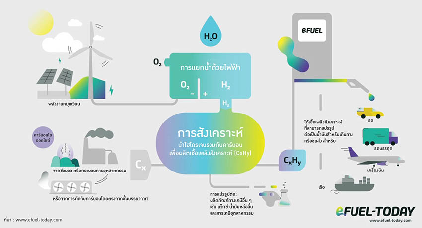 พลังงานหมุนเวียน เช่น ลมหรือแสงอาทิตย์ จะนำมาใช้ผลิตไฟฟ้า ถูกส่งเข้าสู่กระบวนการแยกน้ำเพื่อให้ได้ไฮโดรเจนสะอาด ขณะเดียวกัน ก็มีการดักจับก๊าซคาร์บอนไดออกไซด์จากปล่องโรงงานหรือจากอากาศ เมื่อผสมไฮโดรเจนเข้ากับคาร์บอนไดออกไซด์ผ่านปฏิกิริยาทางเคมี จะได้ของเหลวที่เรียกว่า ‘น้ำมันดิบสังเคราะห์’ e-Fuels แล้วนำไปกลั่นและปรับแต่งจนได้เชื้อเพลิง เช่น e-Gasoline e-Diesel และ e-SAF คาร์บอนที่ถูกปล่อยออกมา จะใช้พลังงานหมุนเวียนตลอดทั้งเส้นทาง เรียกได้พลังงานสะอาดหลายต่อ
